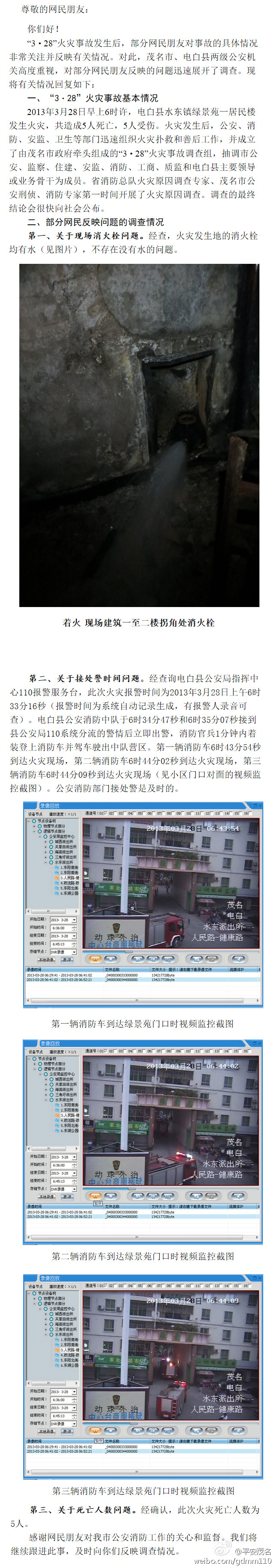 《关于对部分网民就“3・28”火灾事故反映问题的回复》,尊敬的网民朋友: 你们好! “3・28”火灾事故发生后,部分网民朋友对事故的具体情况非常关注并反映有关情况。对此,茂名市、电白县两级公安机关高度重视,对部... 电白人请关注新浪微博:@电白故事
