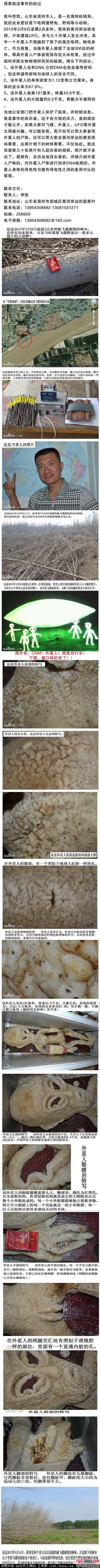 导读: 山东滨州李凯电死外星人事件 电死外星人事件的真相(多图) 【山东男子打电话报警称电死外星人 专家未确认 】近日,山东滨州人李某发帖称自己三个月前在黄河边上碰到五个乘着飞碟的外星人,电死一个后,被他收藏在自家的仓库内。李某说,现在三个月过去了,专家尚没有给 山东滨州李凯电死外星人事件 电死外星人事件的真相(多图)