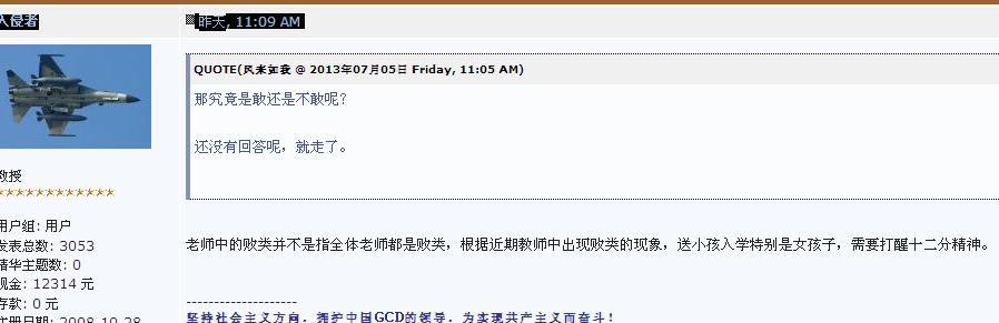 QUOTE(甲某人 @ 2013年07月06日 Saturday, 12:39 AM) 如果你是教师,说出这样的话,想想适合吗?做人要又雅量,不跟别人计较那么多,更重要的是不要随便侮辱一个人。 [snapback]3561319[/snapback] 你看清楚下图额,我没有侮辱他,他怕老师强奸他女儿是他自己说的, 我只是按照他的逻辑回敬他的缪论