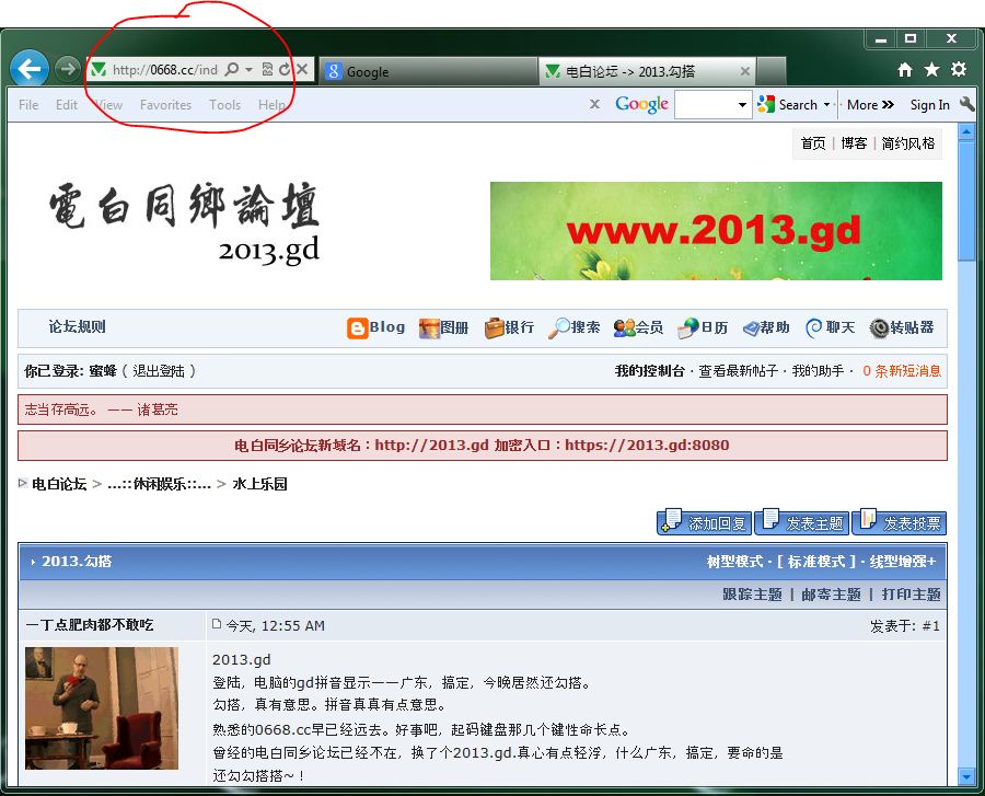 2013.gd 登陆,电脑的gd拼音显示――广东,搞定,今晚居然还勾搭。 勾搭,真有意思。拼音真真有点意思。 熟悉的0668.cc早已经远去。好事吧,起码键盘那几个键性命长点。 曾经的电白同乡论坛已经不在,换了个2013.gd.真心有点轻浮,什么广东,搞定,要命的是 还勾勾搭搭~! 虽然,不懂它的含义就说轻浮有点没礼貌。虽然,版面还是那个版面。 人还是那些人?!什么的什么还是什么... 但,他奶奶的0668.cc它登陆不了了啊。 ...... 以下省略(三五个字) 完。