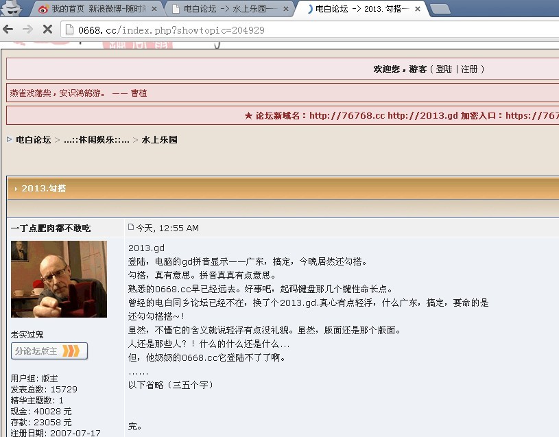 一丁点肥肉都不敢吃 老实过鬼 荣誉会员 注册 2007-07-17 消息 16,134 反馈评分 19 点数 61 2013-07-15 #1 2013.gd 登陆,电脑的gd拼音显示――广东,搞定,今晚居然还勾搭。 勾搭,真有意思。拼音真真有点意思。 熟悉的0668.cc早已经远去。好事吧,起码键盘那几个键性命长点。 曾经的电白同乡论坛已经不在,换了个2013.gd.真心有点轻浮,什么广东,搞定,要命的是 还勾勾搭搭~! 虽然,不懂它的含义就说轻浮有点没礼貌。虽然,版面还是那个版面。 人还是那些人?!什么的什么还是什么... 但,他奶奶的0668.cc它登陆不了了啊。 ...... 以下省略(三五个字) 完。