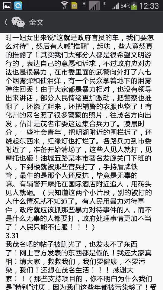 转:昨天(3月30日)茂名发生的一切,我自始至终都在现场,作为一名有正义感的市民,我觉得必须还原真相,还正义一个公道!因为现在打开微信,博客,QQ,基本上都是一边倒,都是口诛笔伐,骂政府,骂警察打人!昨天上午群众的游行示威本来就是没经依法申报的,但在市区游行政府一直没有任何不妥行为,反而要警察到处帮他们指引实行交通管制;但下午的事件就升级了,不知道背后有没有人和其他势力支持和操作,但你应该懂的!普通老百姓会不会主动堵塞高水公路?!而且还计划去堵高速公路,再三劝阻都没用?警察只能清场,但在清场时遭到一部分人的鸡蛋,矿泉水瓶,石块的攻击;而到了晚上事态就完全变质了,部分人到处打砸烧,演变成骚乱了,他们砸名湖,在名湖转盘放火,打交警,砸警车,烧市府办公楼,砸市府,市委办公楼,在市府前翻车,在市府大院里烧车,砸法院,烧治安岗亭,砸店铺,毁坏交通灯,隔离带等公共设施,到处扔狗炮炸过往车辆和行人,烧毁了警车和过往车辆,你还会不会觉得这是广大老百姓的合理诉求!?这分明十足的一帮暴徒嘴脸,好在昨晚2,3点左右从阳江,湛江调武警,特警过来才慢慢控制局面。善良的人们,不要再被利用了,不要再发那些片面的舆论及图片,我们要相信,警察和你无怨无仇绝对是想保护绝大多数群众的,民警不压制暴徒,最终会伤害谁?还记得那年抗日游行无辜被打伤打残的车主吗?蓝天重要、家园重要,稳定更重要!不要像昆明那样等刀砍到自己身上的时才想起需要保护!!!