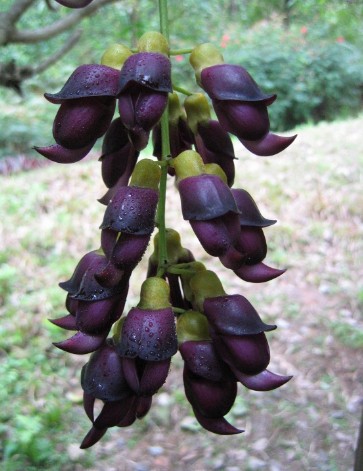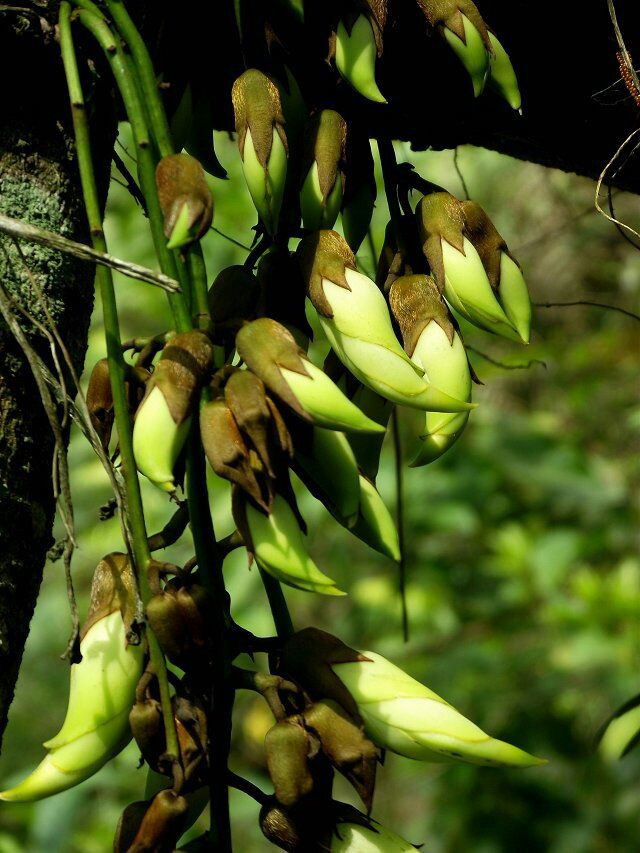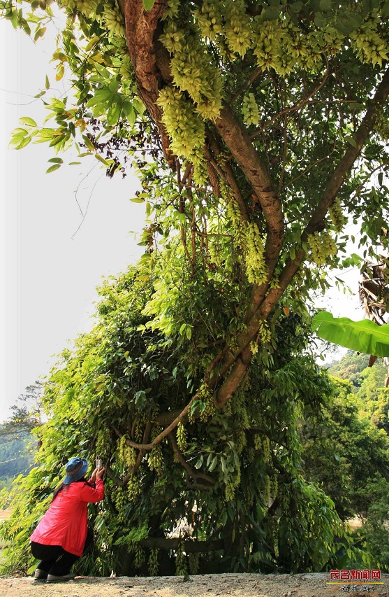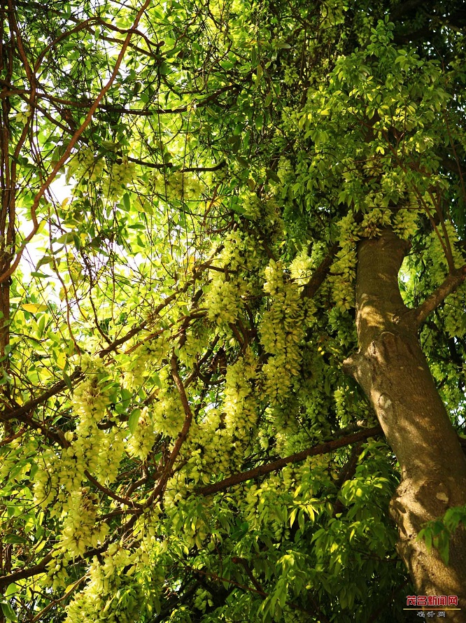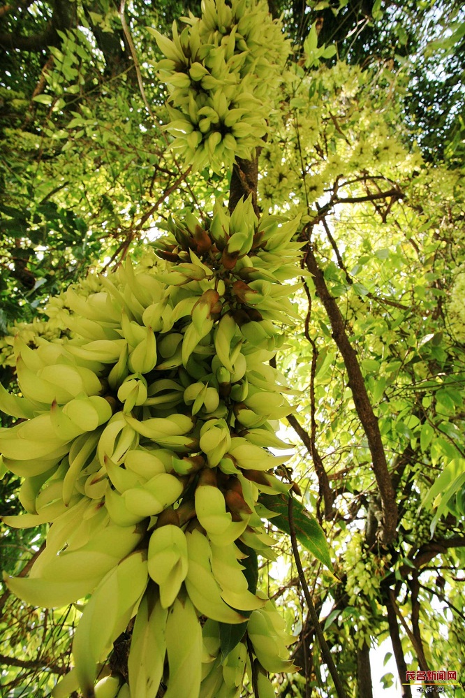 禾雀花,学名白花油麻藤,属蝶形花科,是中国国家二类保护植物。禾雀花外形奇特,花开四(五)瓣,花托似禾雀头,两旁各有一粒似眼睛的小黑点,正中的一瓣,弯弓似雀背,两侧的花瓣似雀翼,底瓣后伸,是为尾巴,花内有一撮细长略弯的花蕊,人们称之为“禾雀内脏”。禾雀花初开时为翡翠绿色,盛开时为柠檬黄色,非常漂亮。它又有着各种惟妙惟肖的动作造型,且“受伤”时还会“流血”,可谓植物界的奇珍异品。禾雀花开在长长的藤蔓上,吊挂成串,每串二十至三十朵不等,串串下垂,游人远远望去,似是百鸟栖枝,雀跃花香,令人叹为观止。