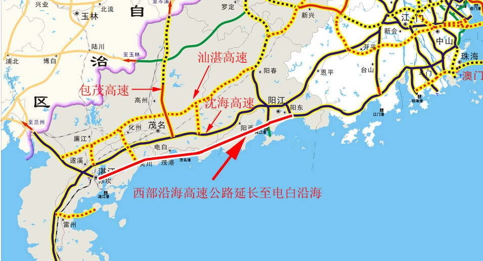 我们电白沿海交通只靠325国道也应在太饿和了,我以前还画了西部沿海高速公路应延长这条线路到电白沿海,不至于这条高速公路到珠海到阳江就止了,这条路年年亏损!