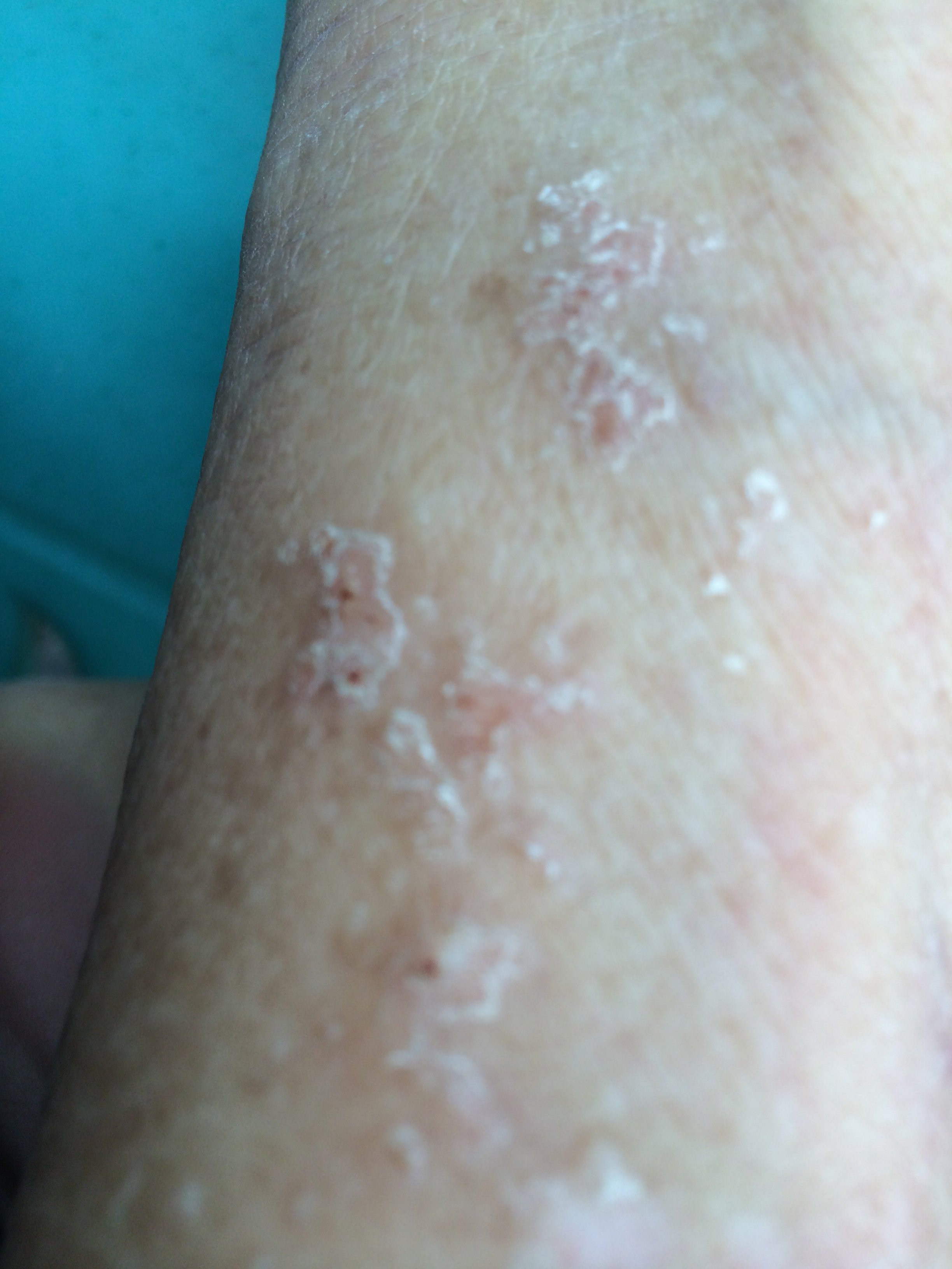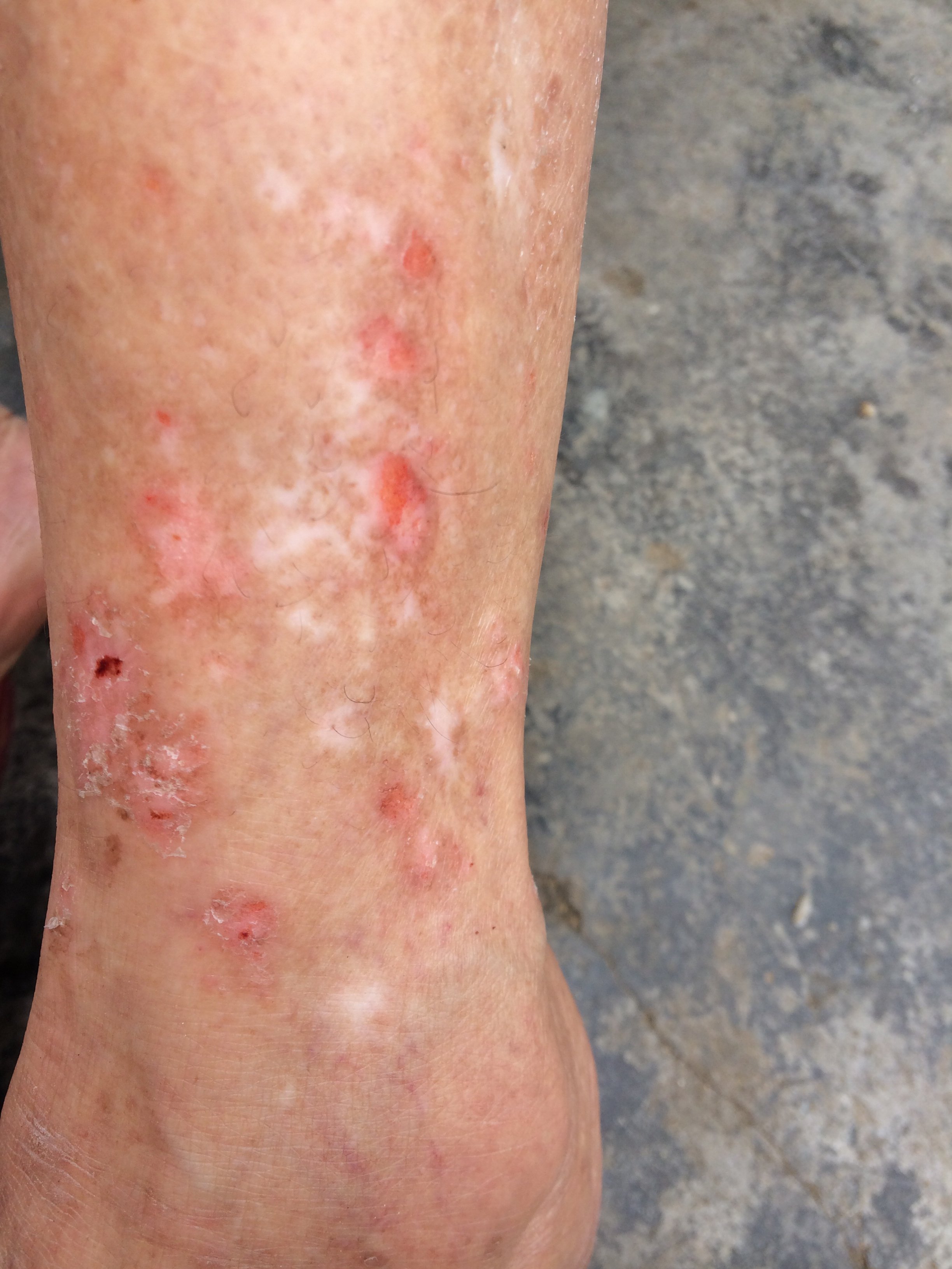 家母若干年前左脚小腿下部分有如下图症状,其痒无比,期间曾带她造访徐长卿同乡,有抑制了一段时间,最近回去,发现又有复发。不知各位有妙方否?
