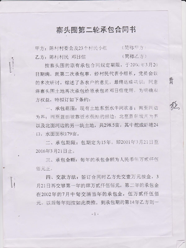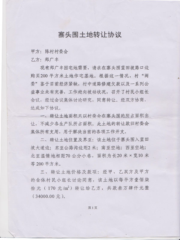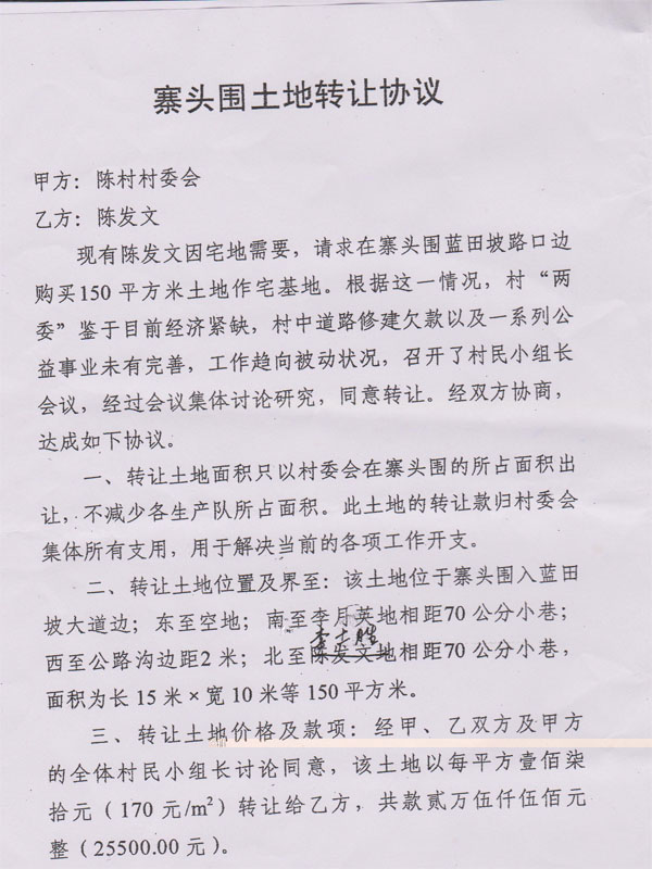 陈村内的寨头海围农田,属于陈村村民集体责任农田,1986年由于客观因素影响,由村委代表村民集体将该农田出租给一村民邓日信作耕地使用,期限15年。2001年合同期满后,村委干部没有召开村民大会,私自找了几个所谓的村民代表签名,便将寨头海围农田又违规续租于邓日信。2010年时任书记邓华干、主任吴奇才,联合镇党委(管片)干部邓斌干等人,未经村民同意认可,偷卖村民农田,出卖土地款项从未公布,不知去向。寨头海围农田上现已有违建楼房十多栋,危害巨大,也导致村民集体利益遭受重大损失。