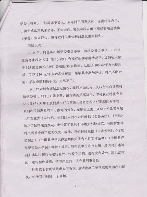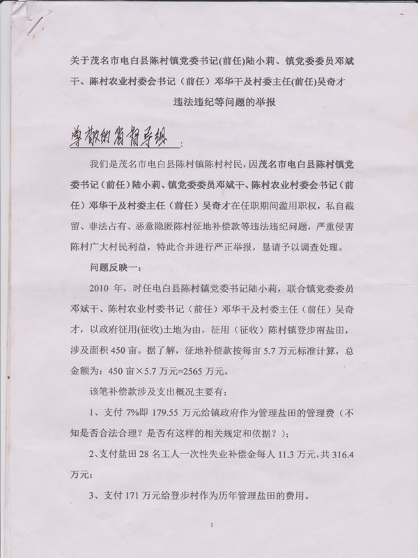 我们是茂名市电白县陈村镇陈村村民,因茂名市电白县陈村镇党委书记(前任)陆小莉、镇党委委员邓斌干、陈村农业村委会书记(前任)邓华干及村委主任(前任)吴奇才在任职期间滥用职权,私自截留、非法占有、恶意隐匿陈村征地补偿款等违法违纪问题,严重侵害陈村广大村民利益,特此合并进行严正举报,恳请予以调查处理。