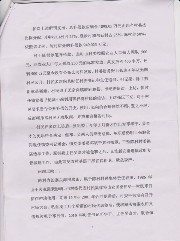 对于陈村该笔补偿款,当时由村委按照农业人口每人领取500元,非农业人口每人领取250元的标准发放,共发放约400多万,还剩500万元至今没有公布去向和发放,村委财务账目长达4年从无向村民公开。村民多次向其时任村委书记和主任追问,但无果,除了敷衍就是耍赖。村民迫于无奈向镇政府和县、市纪委信访、上访,但时任镇党委书记陆小莉利用职权将村民的信访、上访强压下来,对于村民要求责令公开补偿的开支、使用、去向的合理惘然不顾、置之不理,反而呵斥骂村民无理取闹,并放狠言警告村民。