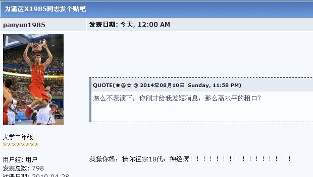 panyun1985 大学二年级 注册 2010-04-28 消息 765 反馈评分 0 点数 0 2014-08-11 #319 QUOTE(蛙子 @ 2014年08月11日 Monday, 11:49 AM) 在取消panyun1985参加聚会资格前,我已经有搜索了解事情。 之前两人有争执,panyun1985于凌晨零点正爆粗,顺便搜索panyun1985过往的言论,常有攻击侮辱性言论。这种言论风格不适宜在友好,和谐的聚会环境下出现。 ★I☆于凌晨零点五分爆粗还击。 [snapback]3684950[/snapback] 电白同乡论坛十周年篮球赛裁判是谁? https://idianbai.com/index.php?showtopic=213288&hl= 34楼, 别跟我说他昨晚才有攻击侮辱性言论,早就有了