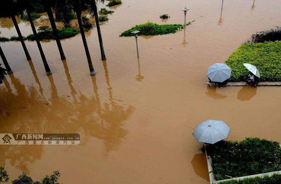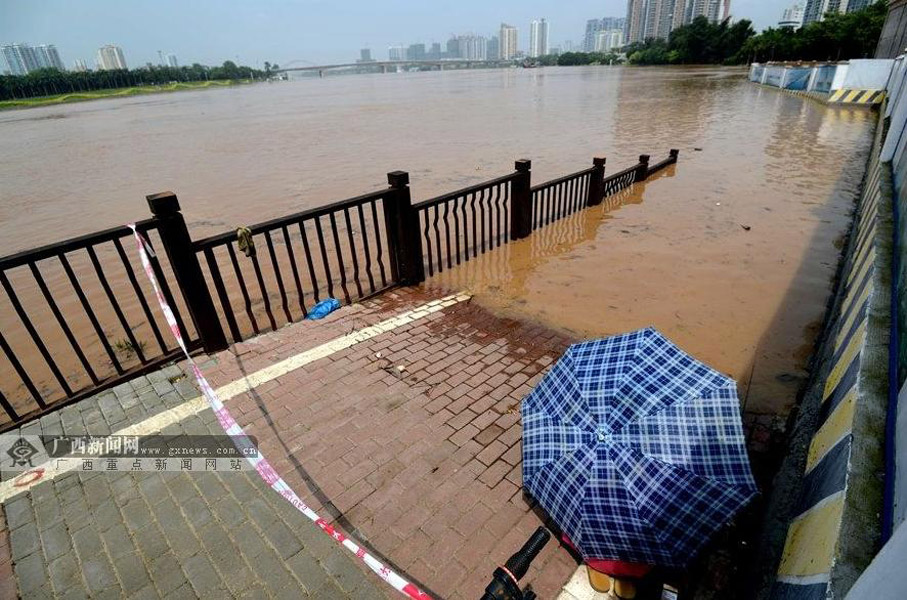 广西新闻网南宁7月22日讯 (记者 胡雁)受强台风“威马逊”带来的强降雨影响,左江、郁江全线涨水,导致南宁母亲河邕江水位猛涨,沿河两岸的绿化带和城市民生广场部份被淹。
