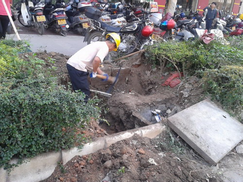 人民路正在铲除公路花带进行改造。请区里解决水东中学门口交通黑点