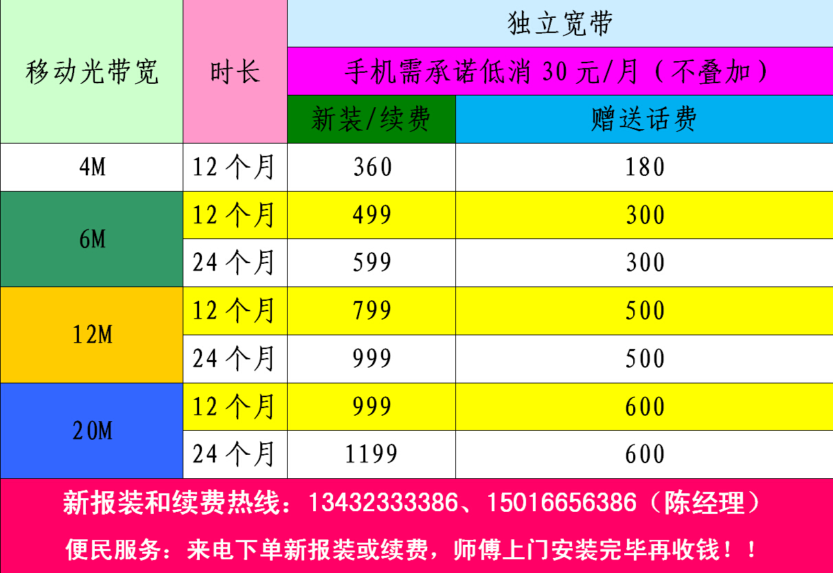 中国移动光宽带 光纤到户,新装和续费送手机话费。 (1人在浏览)