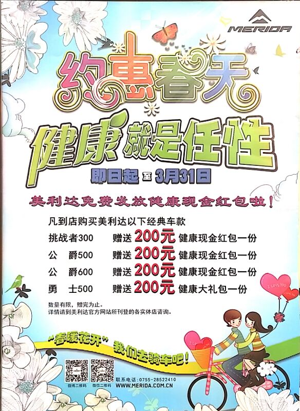 在漫长的冬季,我们曾为迎接春天做了很多的运动计划,在春天这个美丽的季节,和恋人、死党、家人到大自然中骑上单车,既可体验春暖花开的美好,也可锻炼身体放松心情。 在春暖花开的春天,骑上美利达单车,即欣赏了美景,更重要的是赚得身体健康,这是人生比有钱更任性的事情! 美利达自行车(电白专卖店)地址:电白海滨大道海景明珠(建设银行旁)电话: 0668-5289881 13929785544