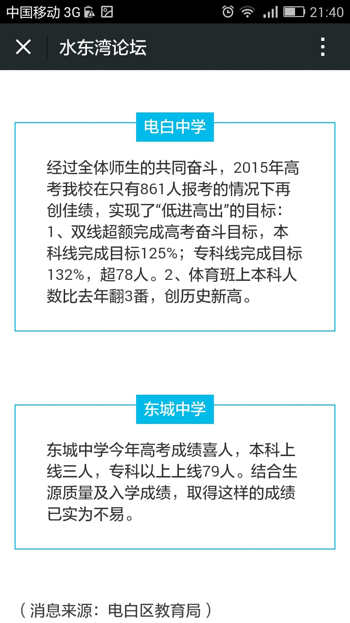 QUOTE(拭目以待 @ 2015年06月26日 Friday, 09:46 AM) 电海、实验、水东等中学的高考成绩怎么不见公布?特别是电海,以往成绩一出开就放烟花了,今年怎么静悄悄的? [snapback]3761854[/snapback] http://www.dbxdhzx.com/Huaihi_ShowArticle....i_ArticleID=424 改在网上放了。环保呵。