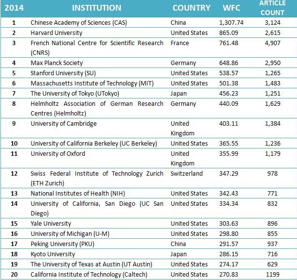 Nature Index 2015 Global:排名前20的机构
