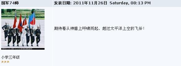 末日之雷 小学六年级 注册 2015-03-11 消息 381 反馈评分 24 点数 1 2015-09-05 #22 QUOTE(自由主义 @ 2015年09月05日 Saturday, 09:10 PM) http://www.d5yuansu.com/2015/09/04/95545.html [snapback]3773013[/snapback] 张局是个有节操的中国军人,国家未披露还处于型号保密的武器哪能够违反纪律到处说? 并不是所有的党员干部军人都如你这般不知廉耻的。