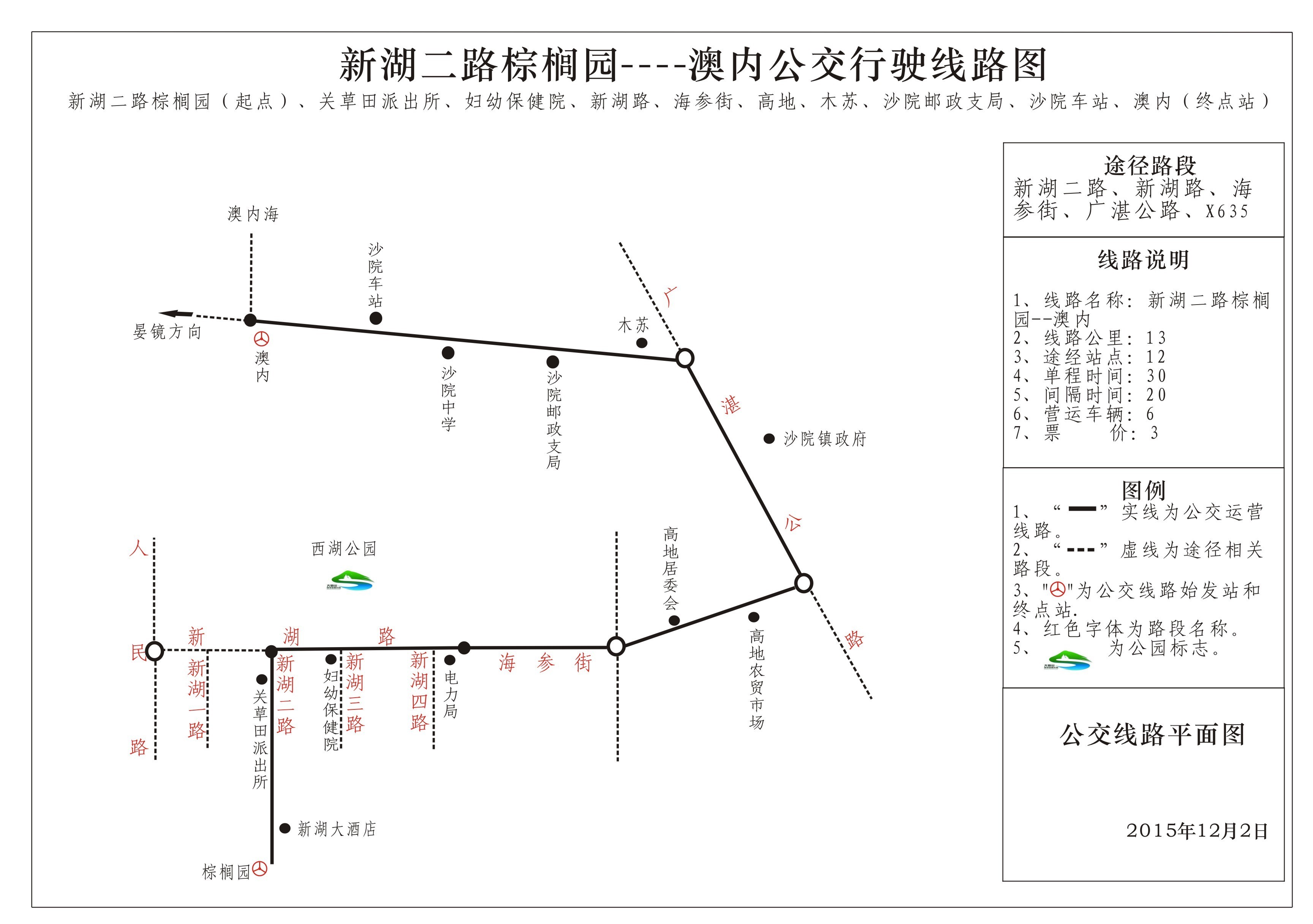 途经:新湖二路棕榈园(起点),新湖大酒店、关草田派出所、新湖路、妇幼保健院、海参街、高地、广湛公路、沙院镇政府、木苏、沙院邮政支行、沙院中学、沙院车站、终点:澳内。