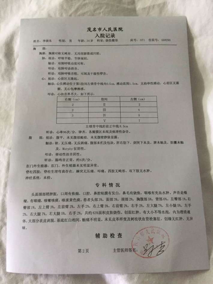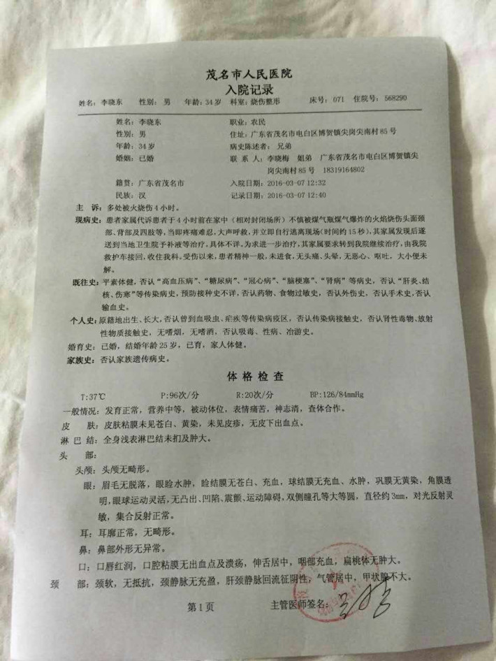 天有不测风云,2016年3月7日上午,一场突如其来的意外煤气泄漏事故,我丈夫李晓东当场被火海包围,现在茂名市人民医院重症监护室进行抢救治疗!经医生诊断鉴定,李晓东全身烧伤面积高达63%,属重度烧伤,呼吸道已被火焰严重灼伤,需插喉管代替呼吸,经抢救仍命悬一线,时间就是生命,我们同死神赛跑。现在每天的治疗费用将近一万元,后续的手术治疗费用估计更是高达50多万元,但是这个金额对我这个靠出海打鱼为生的家庭来说无疑是天文数字,我们已举步为艰。