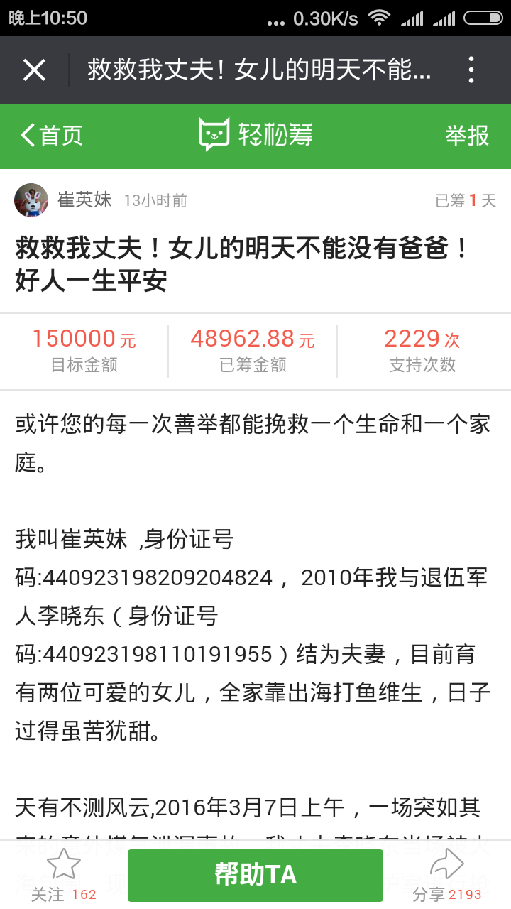 我叫崔英妹 ,身份证号码:440923198209204824, 2010年我与退伍军人李晓东(身份证号码:440923198110191955)结为夫妻,目前育有两位可爱的女儿,全家靠出海打鱼维生,日子过得虽苦犹甜。