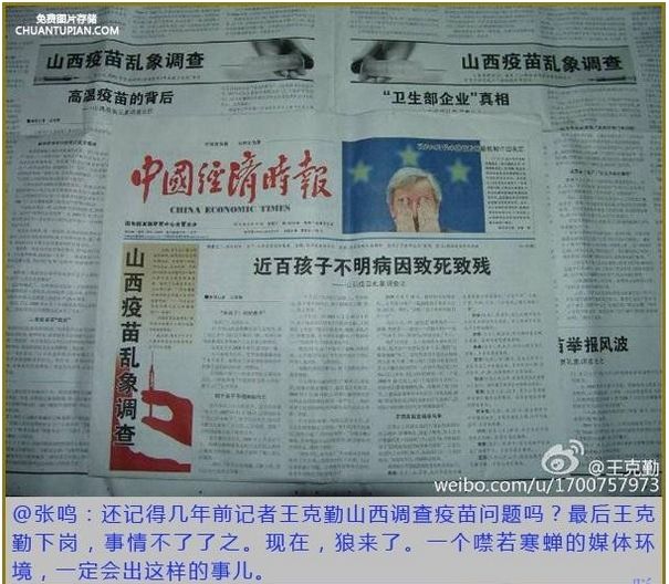 整个微信朋友圈都在刷疫苗.公知说:看一个国家的未来就看他如何对待孩子。我只是个苦力,大道理不懂,只想在这里说说身为个父亲的切肤之痛。不知道健忘的国人是否还记得山西的疫苗事件。2010年3月,《神州经济时报》记者王克勤发表《山西疫苗乱像调查》,文章揭露了78名儿童因注射疫苗而出现的问题,后来,王克勤被下岗,时报社长,总编缉包月阳被调离职务。这期间,部分问题儿童家长曾接到恐吓电话或短信,山西信访局也约见了部分儿童家长,家长被警告别搞“小动作”。