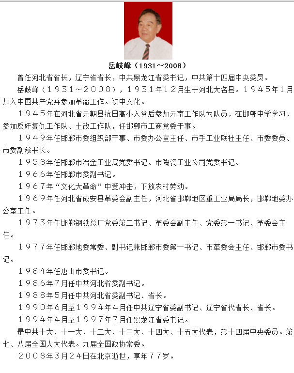 岳岐峰当年由河北省委副书记身份赴辽宁上任途中,与秘书低调自行驾车前往,在中途吃饭时与当地警察发生纠纷,被用手铐拘禁,并被扇了耳光,最终秘书逃脱,打电话到省里,省里电话到市里,然后一直找到派出所,才救出了岳岐峰,值得一提的是岳岐峰赴辽宁就任省委副书记,主管的正是政法公安工作。2008年3月24日在北京逝世,享年77岁。