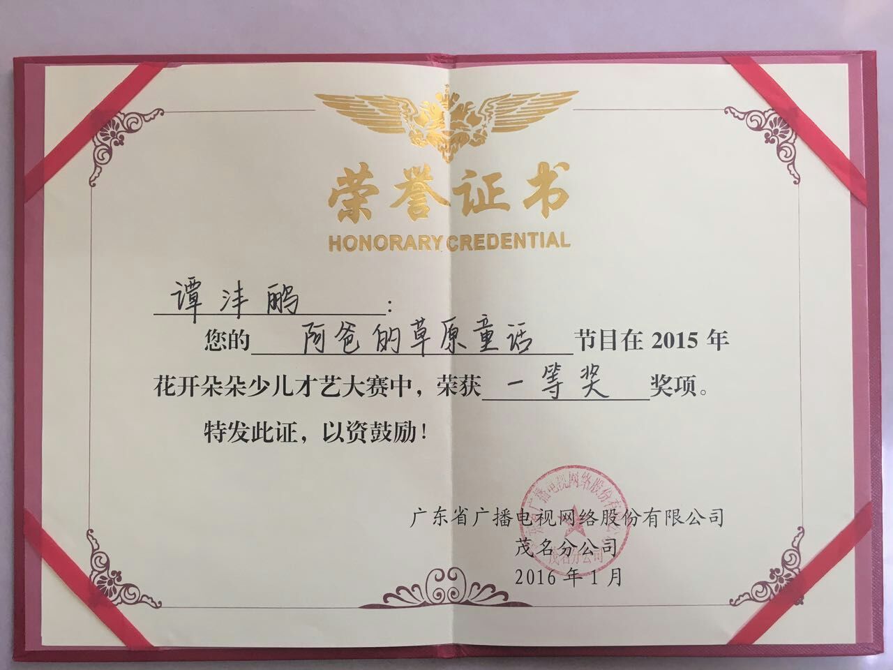 2016年1月,荣获广东广电网茂名“花开朵朵”U互动少儿才艺大赛一等奖;