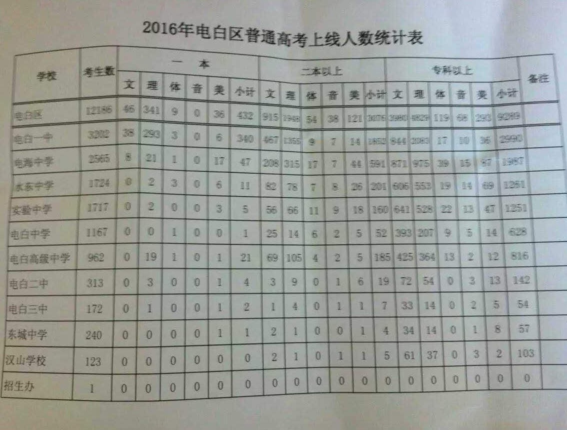 电白水东中学2016年高考喜报:经过全校师生的努力拼搏,我校今年高考再创佳绩,三线超额完成奋斗目标,国本14人(含艺术单考3人),超奋斗目标11人(比去年多8人);省本207人(含艺术单考6人),超奋斗目标49人;省专1271人(含艺术单考10人)。其中应届考生国本上线率创历史新高,体育类国本上线人数全区第一,美术类升本率名列全区前茅!在本届考生入学成绩偏低,考试人数锐减的情况下,我校仍能取得如此成绩实属不易,在此特向全体师生及家长报喜,感谢全体教职工的辛勤付出和社会各界的大力支持!