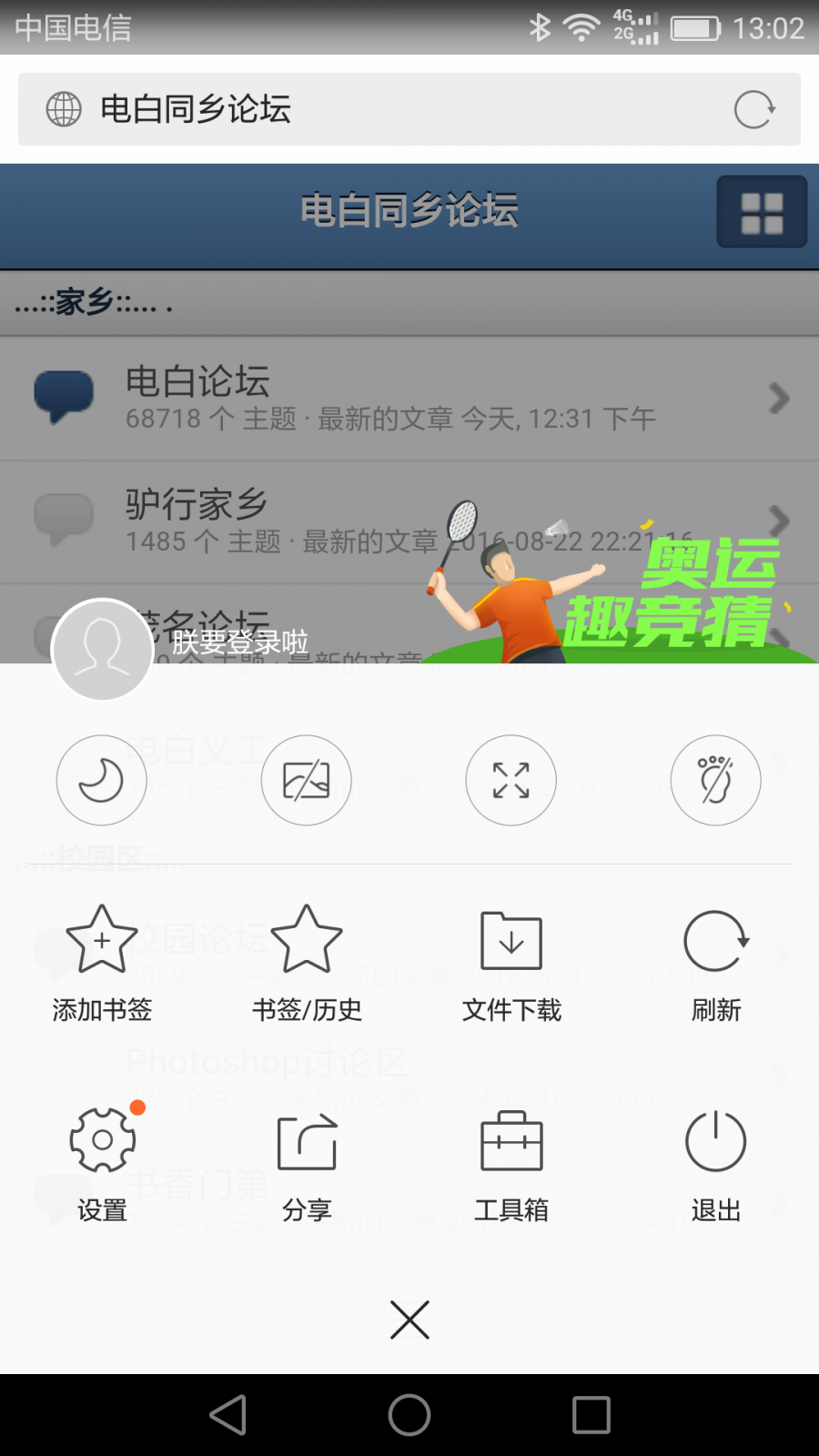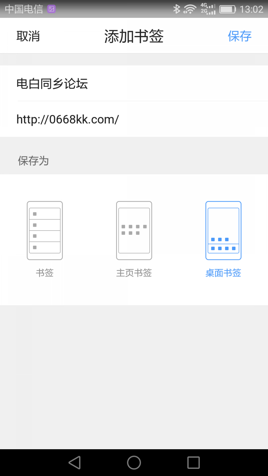 ① 安卓手机,如华为和QQ浏览器,先打开论坛,点选项按钮——收藏网址/添加书签——手机桌面/桌面书签,桌面即生成快捷图标。
