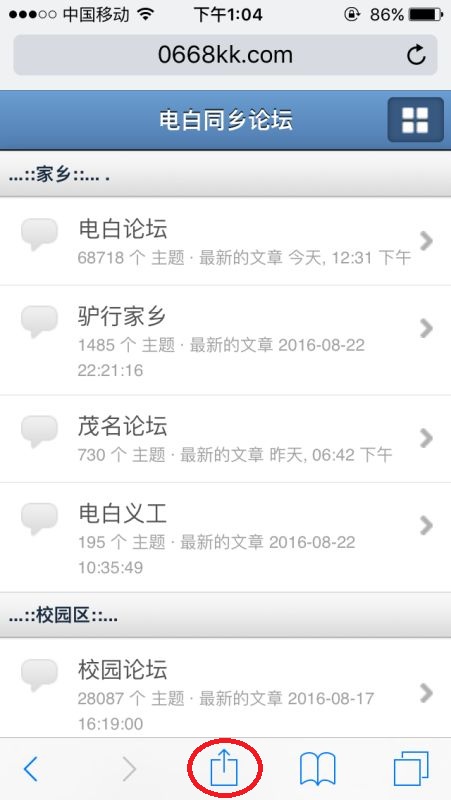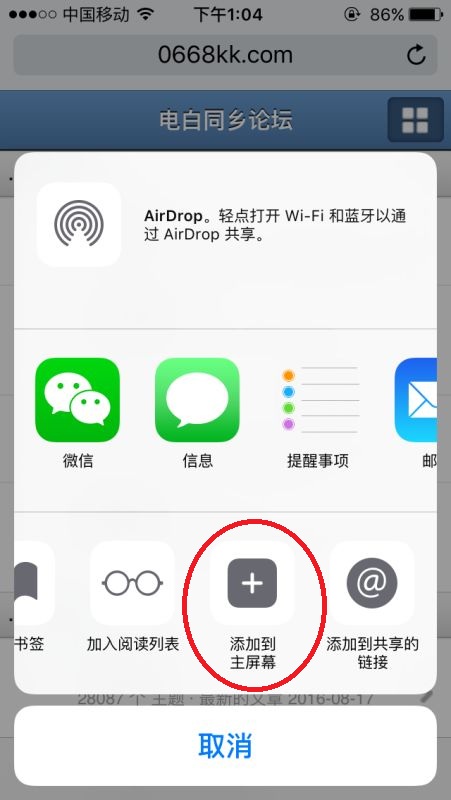 ②苹果手机,在Safari打开论坛,然后点选项按钮——添加到主屏幕,桌面即生成快捷图标。