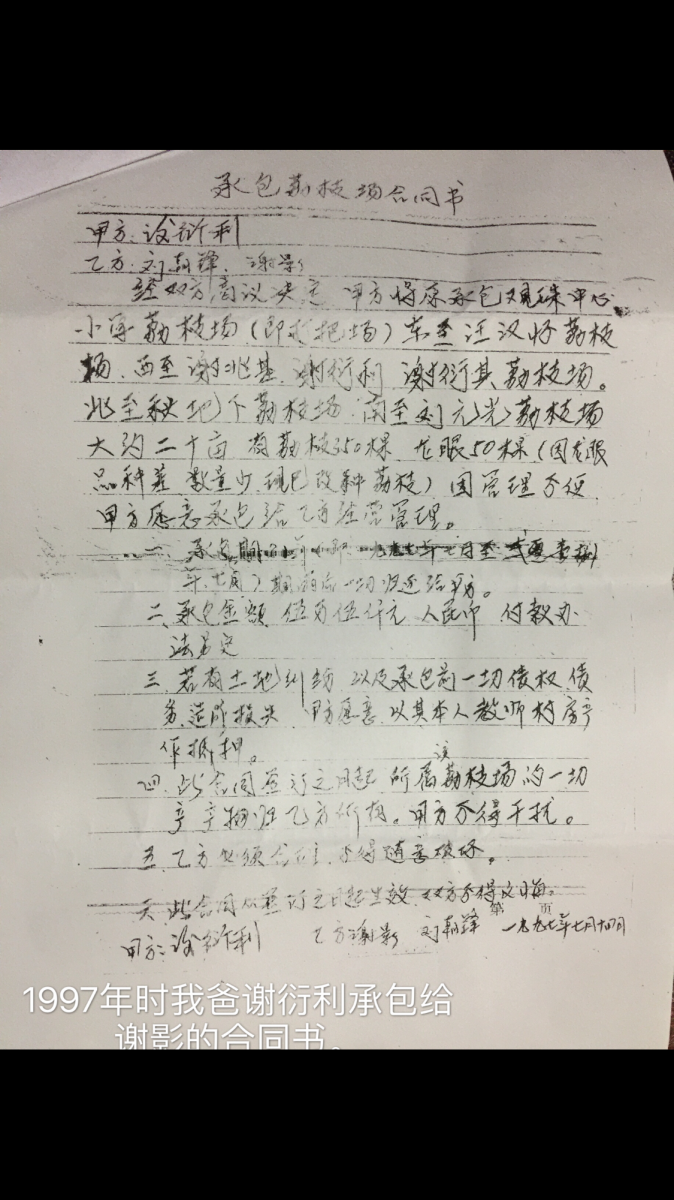 事情经过是这样子的,我爸谢衍利于1986年,响应国家三包四固定,荔枝上山政策号召。在观珠镇观珠管区土四岭,开始种植几百棵荔枝树。近年来荔枝价格下跌,我家在2011年将部分荔枝树清除,改种珍贵树种沉香9500棵,菠萝树100棵。管理经营到现在30多年,一直没有发生过纠纷。我爸有自1997年起至今,承包给谢影的管理合同书一份。谢影也证明过没有纠纷。