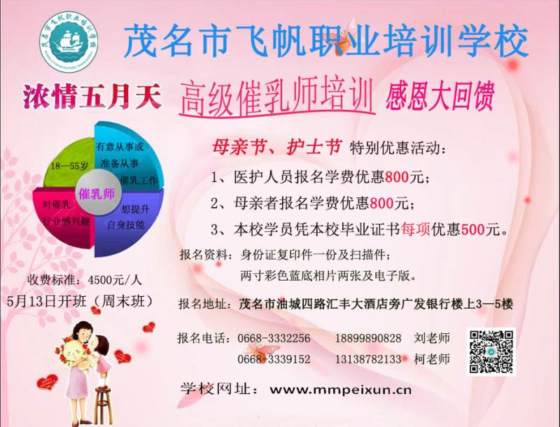 催乳师已经悄然成为最受欢迎的职业之一,珠三角等经济发达地区的薪酬可达上万元,现在只需4500元就可以学到专业的课程。这个五月,飞帆学校推出母亲节感恩大回馈活动,现在报名,优惠多多。