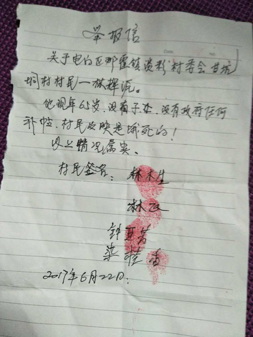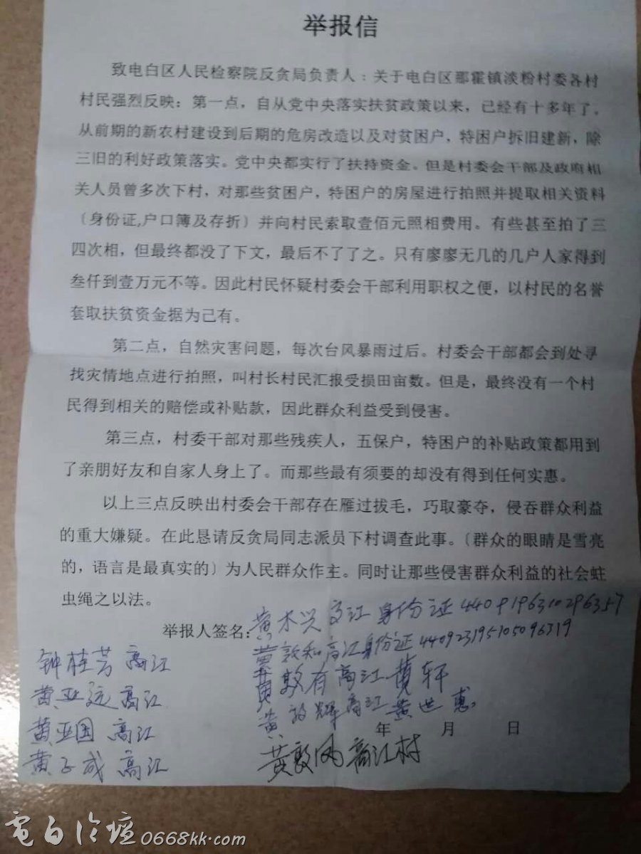 2017年淡粉管区村民对电白县那霍镇淡粉管区村委书记举报内容如下: