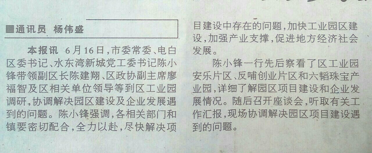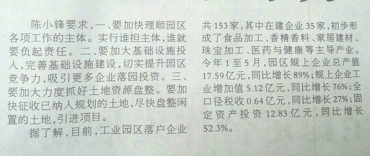 报纸:陈小锋到工业园区调研时要求