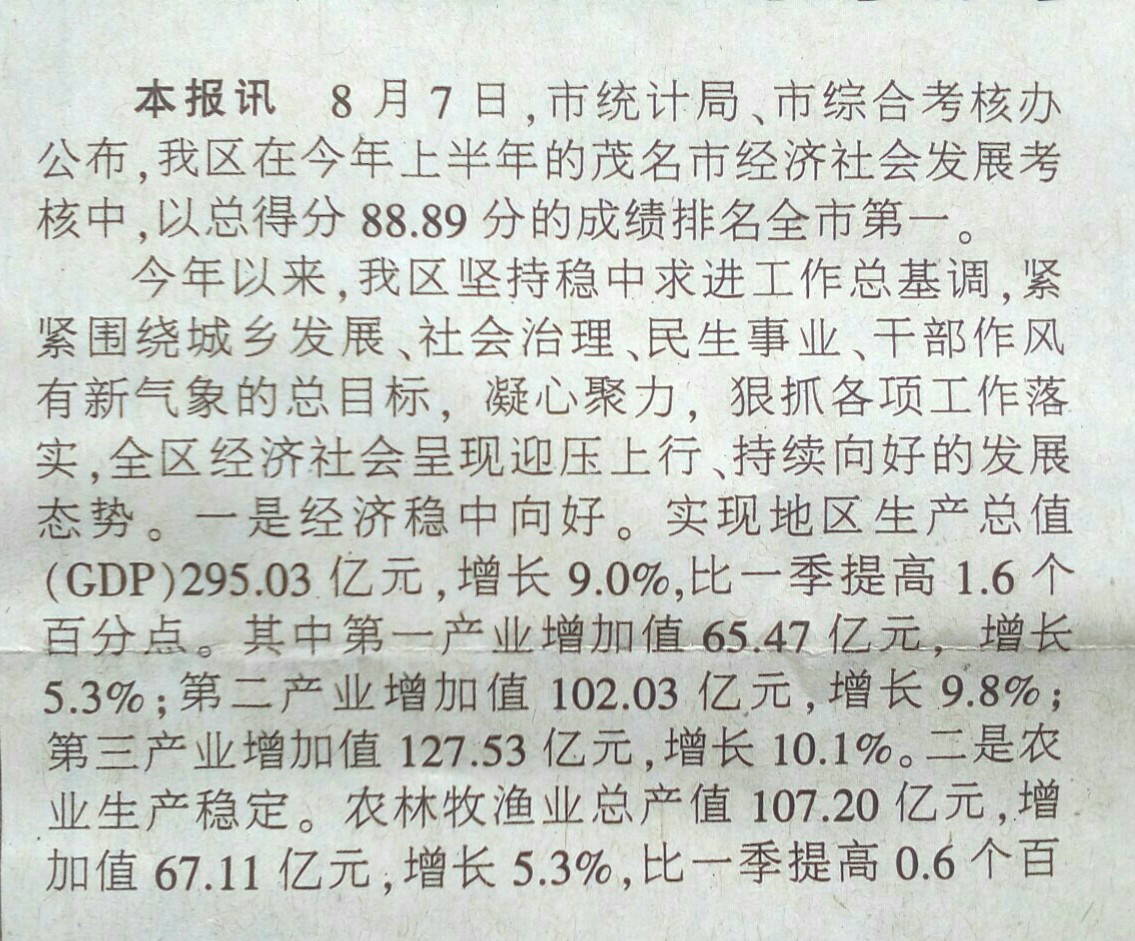 心灯一盏 说: 2017年上半年税收收入超千万的有5个镇:1、水东2.04亿,2、羊角1.24亿,3、陈村4.35千万,4、南海街道办2.43千万,5旦场2.33千万;不足百万的也有5个镇:17、马踏87万,18、黄岭75万,19、罗坑72万,20、那霍61万,21、望夫29万。 营改增后地税收入还能增长,利害。 点击展开... 少了羊角,电白就真够白的了。