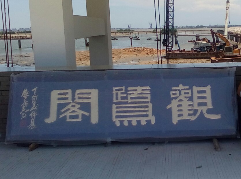 其他 途经海湾水闸,见有人在安装牌坊与见一群人在...