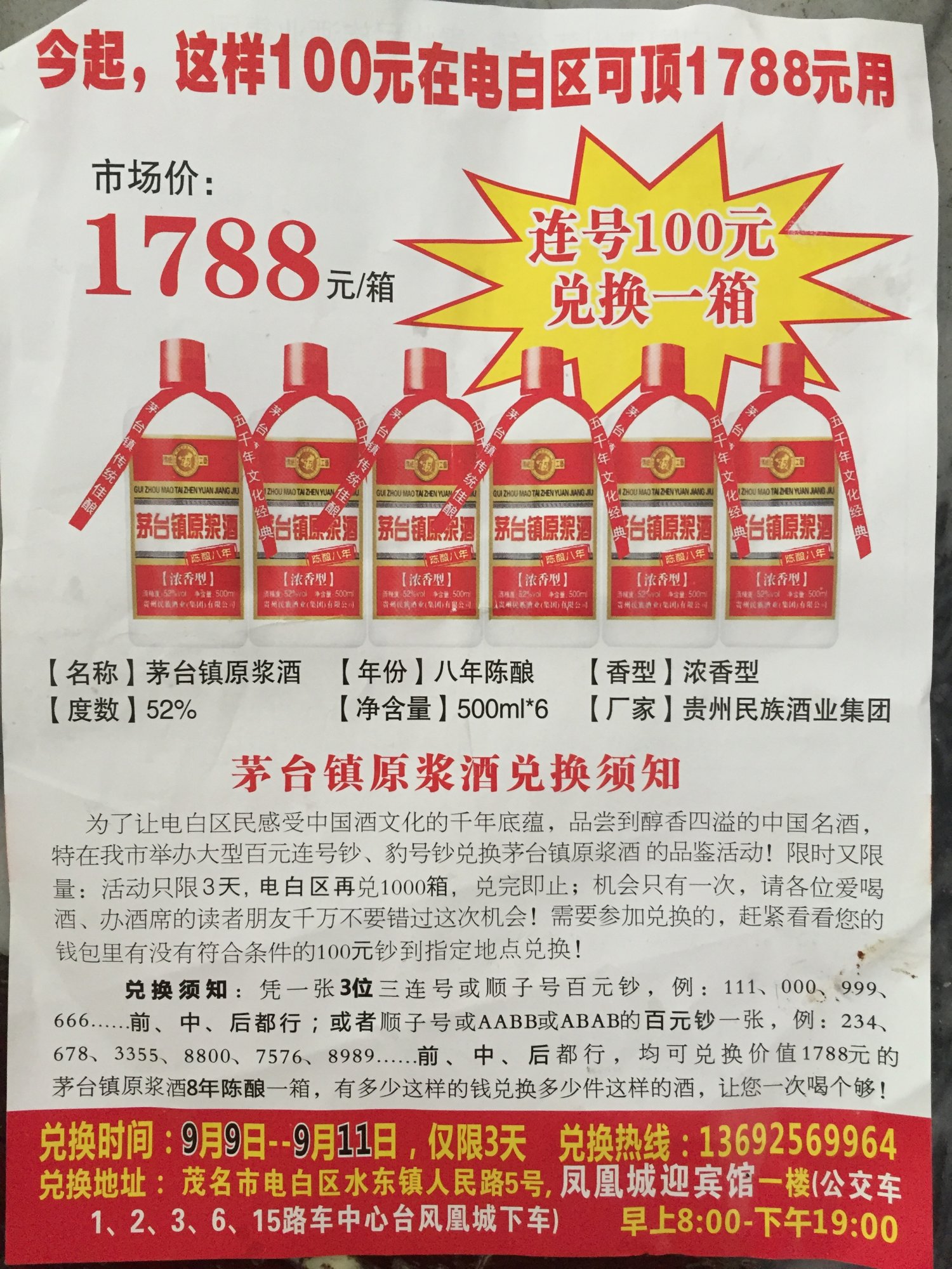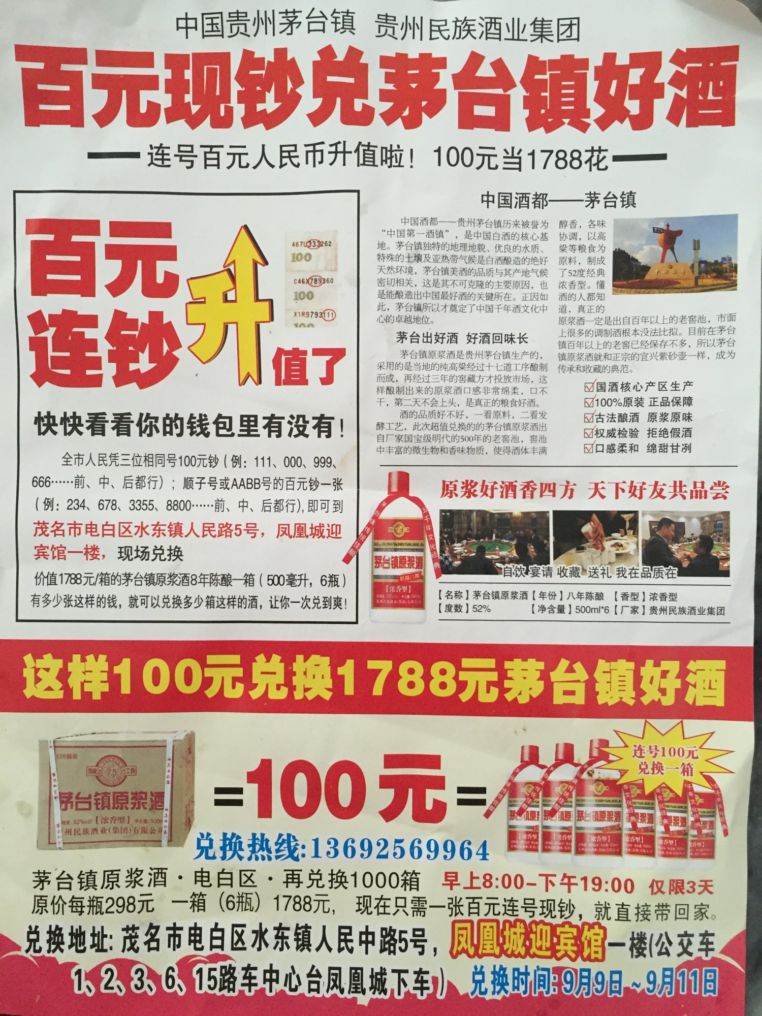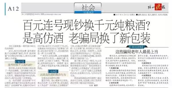 就是假意说你有连号的一百元钞票,就可以换他们“价值一千多”的名牌酒,