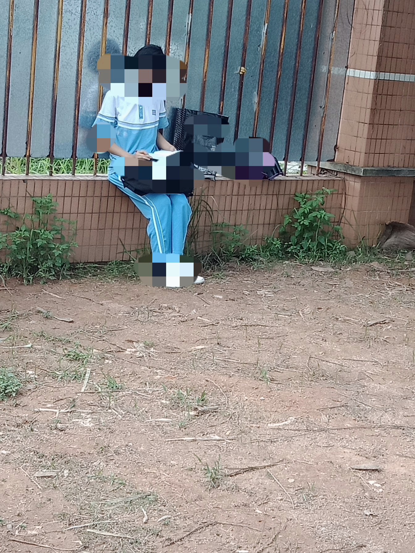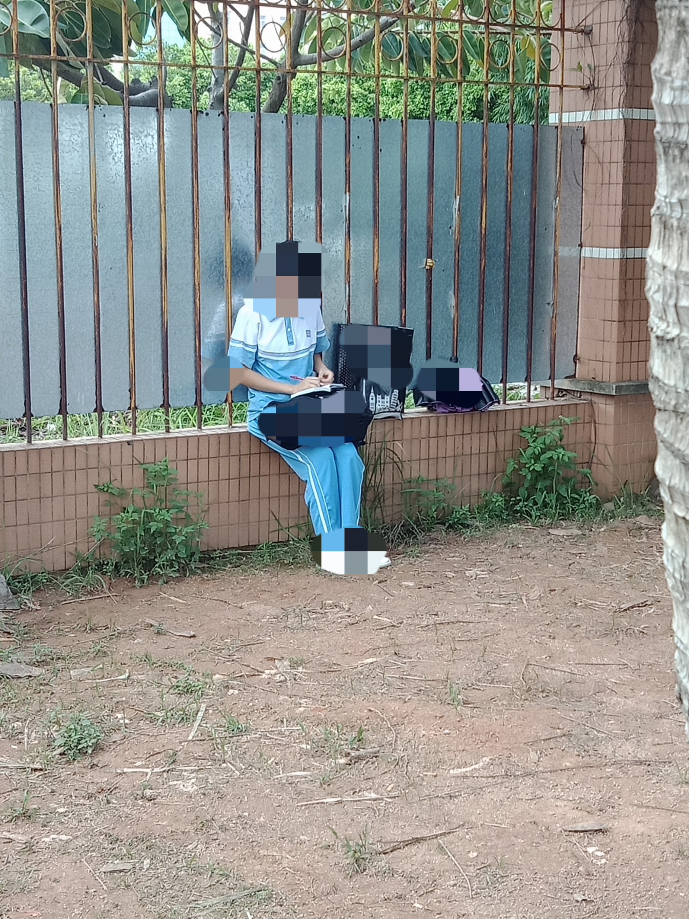 在某高考期间(因学校大门还紧闭还不能入校内),拟见一位诂是高一或高二学生独自坐在校外墙壁上,默默复习着~