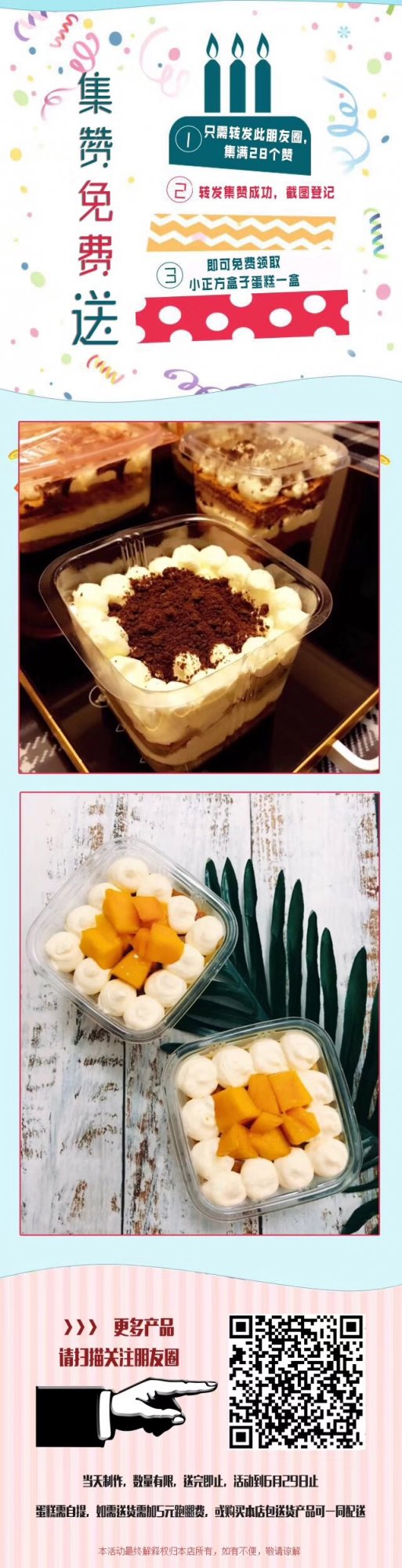 免费送 免费送~ 只需转发此朋友圈,集齐28个赞,即可获得❗️图一正方盒子蛋糕一盒❗️[愉快][愉快]动动你手指吧~