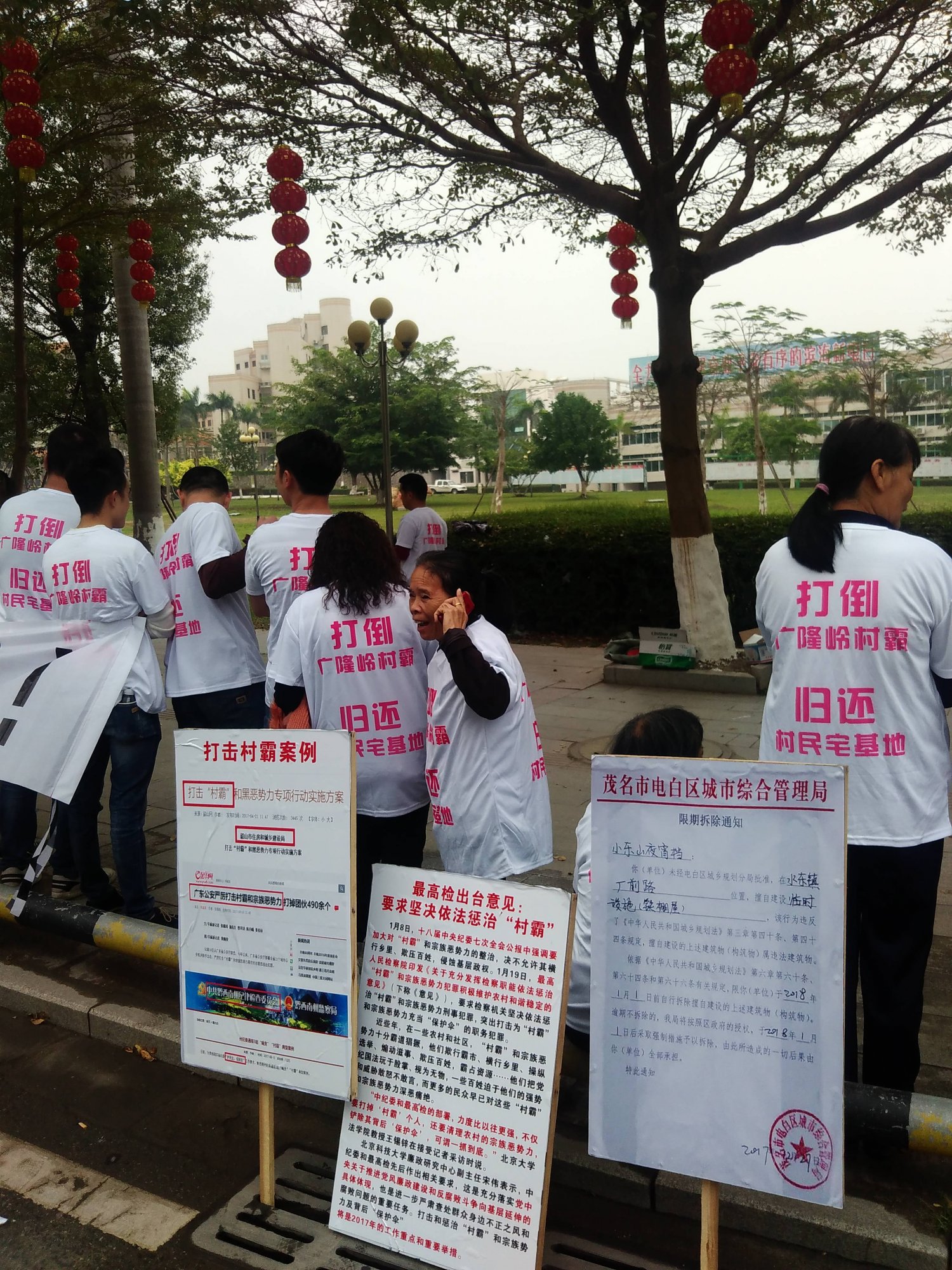 这是广隆岭人作出的艰难一步,也意味着大家撕破脸来场真情告白。广隆岭村全体村民首次到电白区政府静坐抗议,对于有关部门的处事方式和办事效率来讲,广隆岭村民非常不满意,多次忍让多次等待,我们一直支持政府工作却换来的是一次次的忽悠哄骗。拿回属于自己的土地村民看不到希望,老去的人更是死不瞑目。我个人也时刻牵挂在心头,生怕自己心血高顶不顺,无论村民在哪里抗议都是需要请假罢工参与的,村里已经很贫穷还要凑经费维权打击村霸,实在消耗不起这样的折磨。没有收入还要付出金钱对个别家庭是严重透支。村民迫切想要得到政府一个有力说法,才有不约而同的一致想法,干脆就到区政府。好在区政府就在自家门前不远,从村里徒步过去也就1里多路,老人们走的动都要去,走不动的也想要搭车去。这天正好碰上一个妇女在维权,她说是每天都拿着凳子到区政府信访等领导出现,看她像被领导冷落多次的模样,她的情绪非常激动,她的故事听着也十分凄惨,她更有勇气对着几十特警和政委发泄骂得狗血淋头。森高啊叔踩着凤凰单车经过表示支持,说着说着热泪盈眶,好事者路过频频停车拍照录像。静坐许久华区长接见村民代表,听他们回来反映说政府表示2月5号左右可拆除……