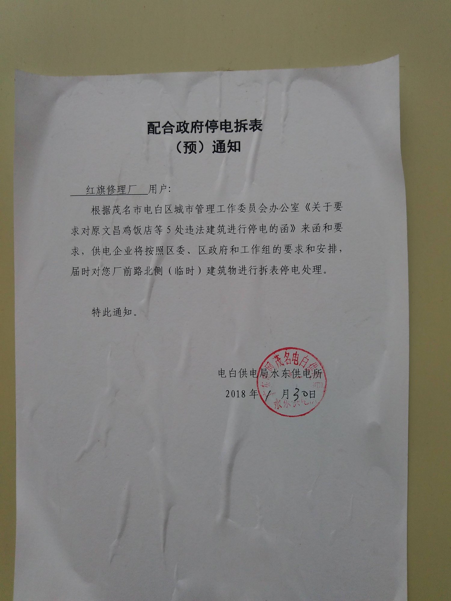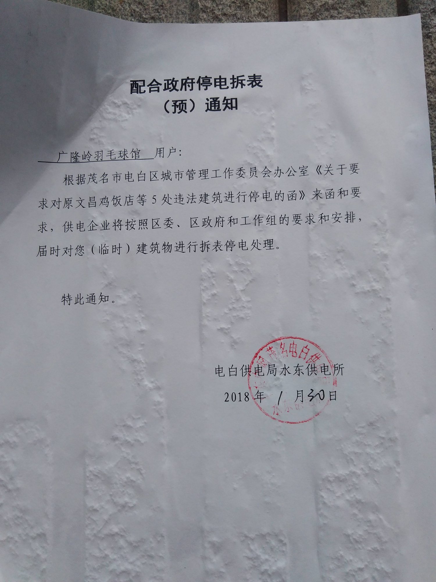 政府应该是看村民态度或许诚恳认真,2月1号下发停水停电通知,村民陪同去观看粘帖。2月5号有关部门对违建经营场所实施停水断电,这是广隆岭人从2017年就跟政府交涉发出的请求,虽然姗姗来迟,也应该给政府个大拇指,那时候还是林涛负责牵头办公。