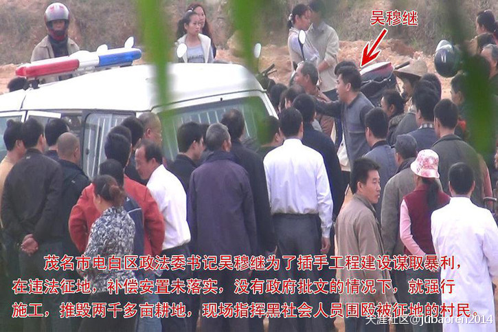 五、被举报人吴穆继,利用其惯用且有效的手法,与坡心镇牛六架村委会书记兼主任陈锐(地方都称其“千万哥”)勾结,拉拢村长和其他白粉头、赌博头、黑社会非法插手介入没有经村民推选的假村民代表,暗箱操作,违法强征牛六架村一千多亩土地,征收面积与事实不符,严重缩水,吴穆继利用公、检、法特权和黑社会势力随意殴打被征地的村民;陈锐利用手上的公权胡作非为,贪污风暴在此盛行却没人问津,原由就是受被举报人吴穆继包庇和保护。另外,2014年3月基层换届选举,牛六架村委会书记兼主任陈锐为了维护其贪污不受干预和怕被揭发,利用被举报人吴穆继为后盾,吴穆继动用300多名警察进村威胁选民的选举事项,将落选村委会书记兼主任陈锐的选票强行作弊,参假了两个票箱共902条票清一色同一字体笔迹的选票进行为陈锐作弊。吴穆继一手遮天,村民失去公平、公开、公正的选举,众人目睹此过程,广大人民群众无可无奈说:“以权压法,官压一切”。被举报人吴穆继显然已经成了“地方老虎”的事实。