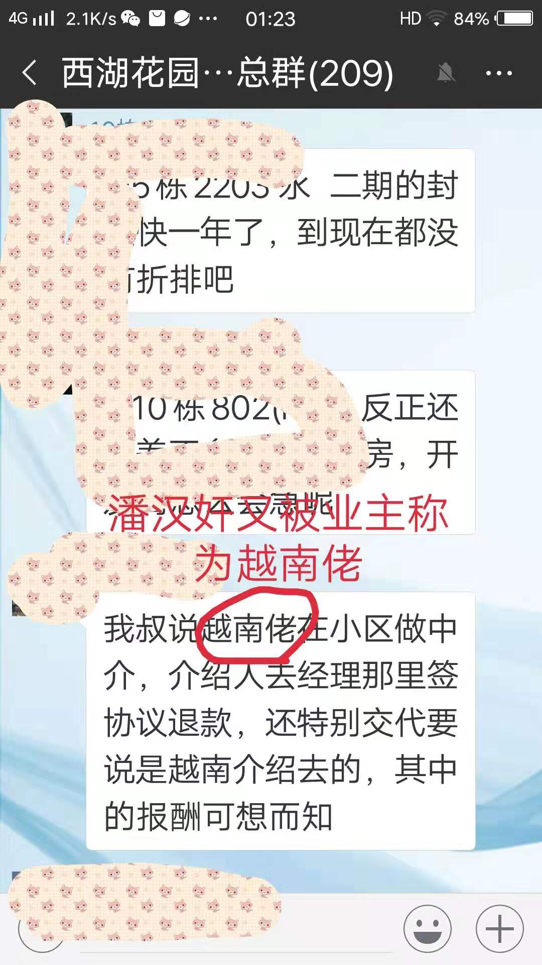 二、西湖花园有多丑?花园丑,人格更丑!电白二建打造如此垃圾精品,延迟一年半交楼,不但不诚心向业主表达歉意,而且还妄想通过看门狗诱骗、分化、压制业主,达到强行交楼目的。不少正义业主强烈维权,冒牌业主群群主潘小良(4栋1704房、自封龙哥,实是大憨一只,被业主称为汉奸)充当看门狗,用尽丑陋招数试图帮开发商瓦解业主维权行动,他尤其喜欢欺负女人,可以骂到你连妈都不认得。[捂脸]