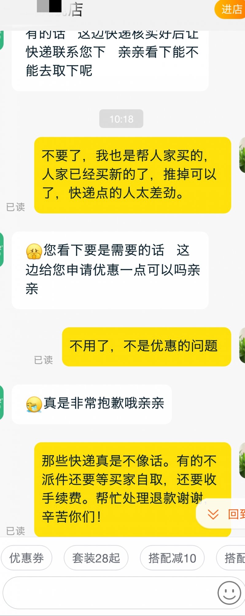 昨晚我把订单申请取消了,帮亲属买的卫浴用具到了站点几天也不打电话派件,而且听说有些镇等自取还收五元手续费。然后问了亲戚说等着用就去实体店买了,果断退掉。 Screenshot_2019-01-14-23-11-19-630_手机淘宝_mh1547549350328.jpg Screenshot_2019-01-14-23-11-43-639_手机淘宝_mh1547549469257.jpg Screenshot_2019-01-15-10-23-04-993_手机淘宝_mh1547549544053.jpg
