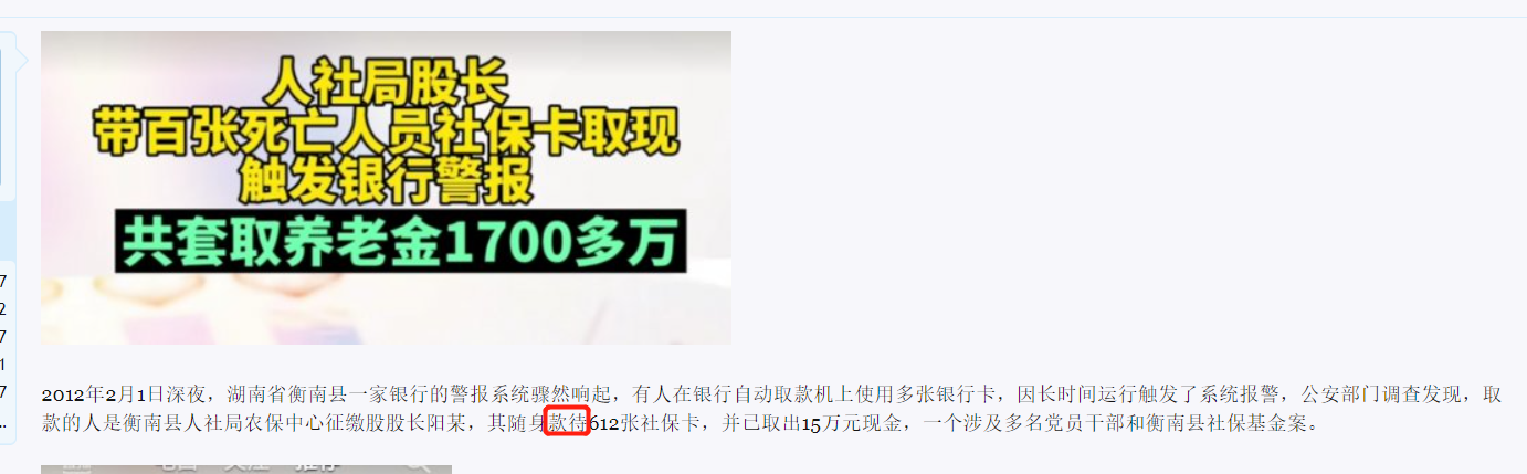 2012年2月1日深夜,湖南省衡南县一家银行的警报系统骤然响起,有人在银行自动取款机上使用多张银行卡,因长时间运行触发了系统报警,公安部门调查发现,取款的人是衡南县人社局农保中心征缴股股长阳某,其随身款待612张社保卡,并已取出15万元现金,一个涉及多名党员干部和衡南县社保基金案。