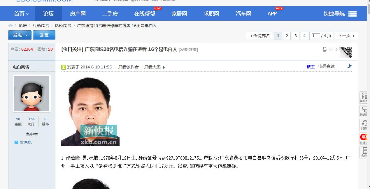 1.jpg 2.jpg 3.jpg 4.jpg 在电白论坛里应该有不少人认识陈贞这个人吧,在茂名论坛2014年的电信诈骗话题里,各地区的人对电白人的讽刺、嘲笑、辱骂、相信不少电白人都有身同感受吧;但时隔五年了,电白人好不容易在外人的眼里逐步有了改观,却被人称为“陈老师”的败类再次拿出来讽刺、嘲笑,再次掀起热浪!‘aster’就是他在茂名论坛的用户名,‘tianya’是他在电白论坛的用户名,有一个叫‘海滨湾’的不知是他的超级粉丝还是他本尊;他自称为电白人,为何要这么做,有何用意呢?此人不出来给电白人一个交代,必须跟他没完没了,要不对不住身份证上“电白”两个字,望各位电白老乡能提供下他本人的详细信息!!!
