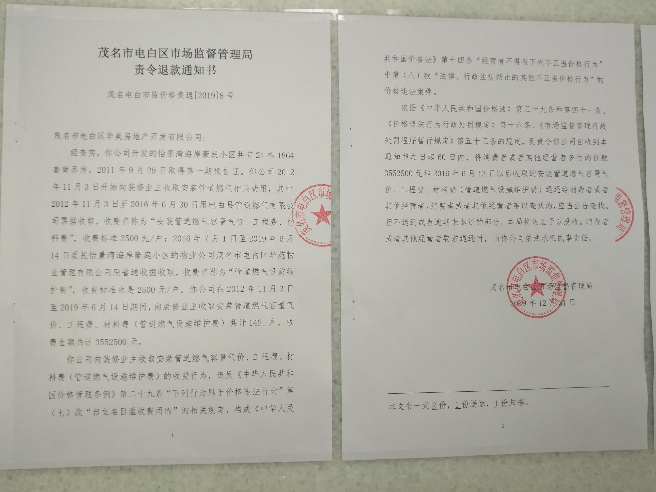 去年政府已明文通知开发商不得收取业主燃气安装费,但怡景湾还违规收取每户2500元!有关部门已经发放管道煤气初装费退款通知书给开发商(物业公司)老板张福子,他拒绝签名,市场监督管理局已经和公证处一起留置送达。