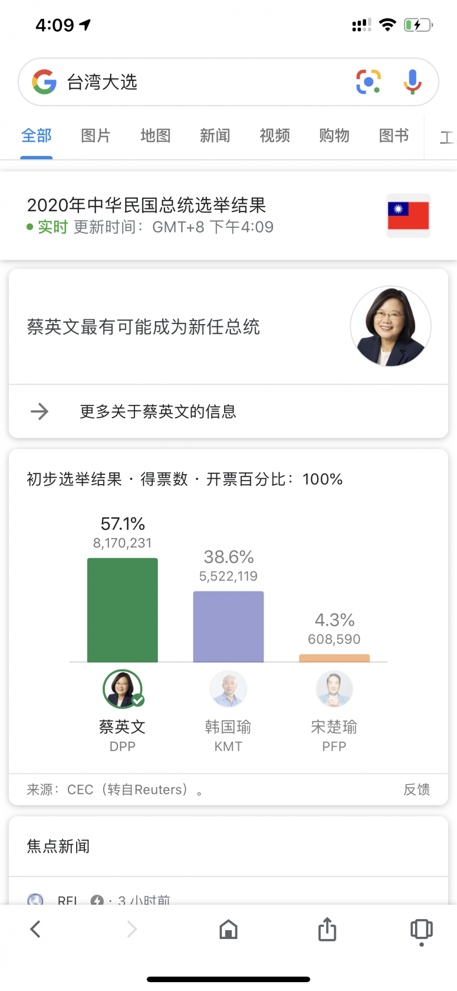 蔡:230萬6911票