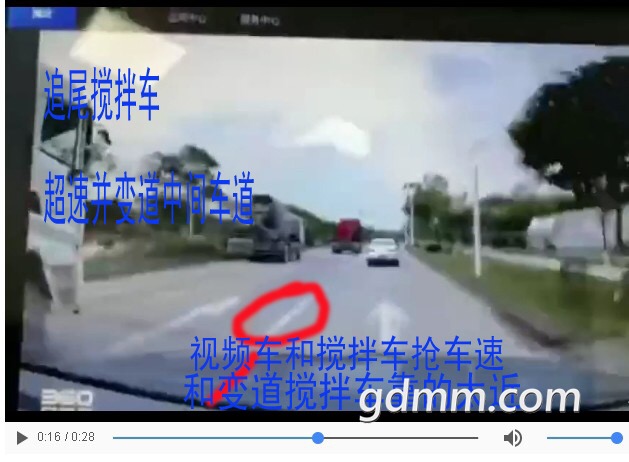 13秒时第二台田螺车走在中间车道,见左车道前有田螺车,自己中间车道有红色拖头,想变道右边紧跟那两台小车超过拖头,然后成为开最快田螺车,第1个赶到工地打混凝土浆,车高有盲区,从中间车道变道右侧车道时,没留意到后面已有奥迪车突然超车上来,奥迪车速快差点冲过去,但还是被中间变道田螺车侧刮到左尾侧,受力后奥迪橫向撞向最左边,发生惨剧!奥迪车超车时见左侧有两台田螺车,以为可以超车甩开,忽然第二台田螺车从左侧变道中间,又一下子变道到右侧了,生生到撞到左尾侧横向冲失控。一般情况下三台搅拌车都想第一时间赶到工地