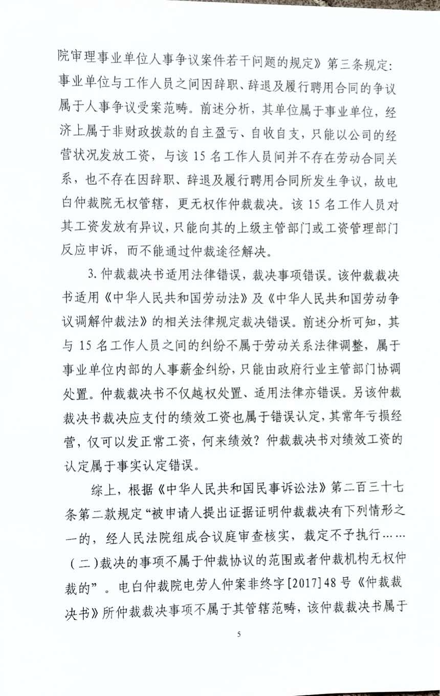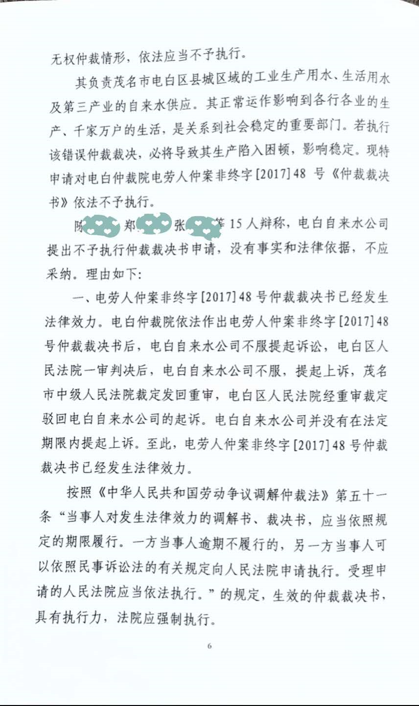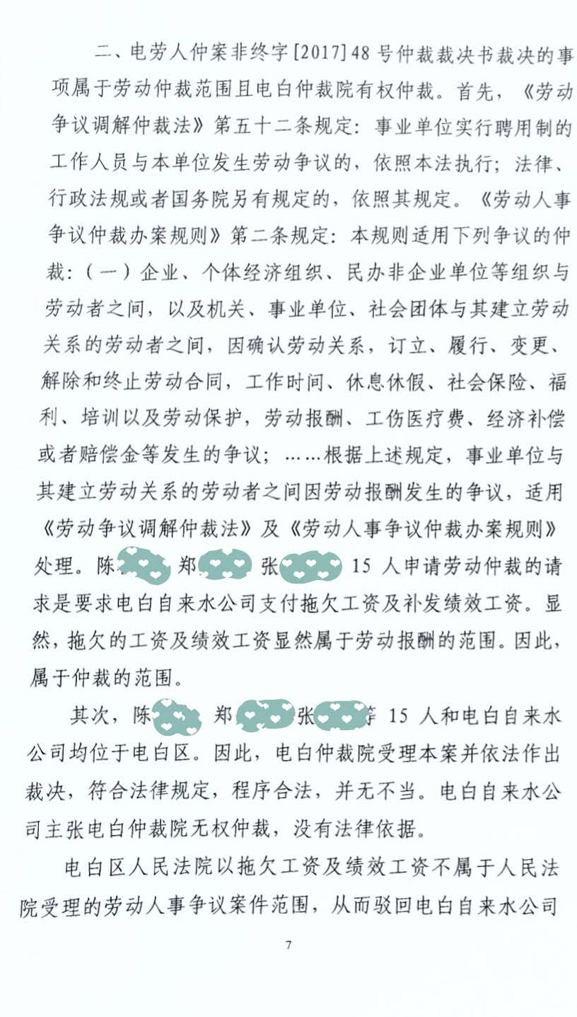 我们是电白区自来水公司的可怜的职工。都是事业编制身份,自来水公司也是公益性第三类事业单位。从1998年开始以经营困难为由拖欠工资到如今。我们多次上访无果!其中自来水公司也做出回复,单位困难无法一次性支持,等死后由家属申请,再考虑一次性返还。这么荒唐的书面信访回复书,竟然是一个国家单位作为违法拖欠职工工资的回复!!由于我们收入无法维持生活被迫向劳动人事仲裁庭提出仲裁。仲裁支持我们的诉求。单位不服向法院起诉,电白法院判决维持仲裁裁定。自来水公司又向茂名中级法院提出起诉。提出我们的事业编制的身份欠薪不属于法院管畴范围。在自己作出信访回复书等证据面前也不承认欠薪。中级法院发回电白法院核实我们的身份。电白法院竟然在劳动法明确规定:事业单位,劳动报酬属于劳动人事仲裁处理。而做出不属于法院管筹范围。驳回自来水公司的起诉。而自来水公司在起诉有效期放弃提出起诉。那我们在律师指导下向法院申请强制执行。在封帐划帐回法院后。自来水公司又以劳动人事仲裁庭无权作出仲裁为由向执行局提出不予执行。而执行局却又采纳了,由三个执行庭长组成合议庭,越权做出不予执行决定。根据劳动人事争议仲裁庭办案法则第一条已明确规定事业单位,劳动报酬属于仲裁处理的。也有法律规定在劳动仲裁结果出,有效期半年内向中级法院提出推翻。但即使各条法律明确规定下。执行庭竟然对各条法律视而不见违反规定作出不执行已生效的劳动仲裁裁定!!所有律师都感到气愤!这根本就有无视法律!!面对这个不公平!我们一面信访,一面向纪律反映!结果都是不了了之!!各部门串通一气!!法院把我们推向一个死循环!!我们走了二年几的诉讼之路,现在又让我们重新起诉!!我们每个月拿着二千几元的工资真的无法维持生活。现在单位又给政府承包给北京首创集团,我们将又面临下岗。我们真的走投无路了只有借助媒体的力量!!希望大家能帮帮我们!!希望大家转转发各大论坛。万分感谢!