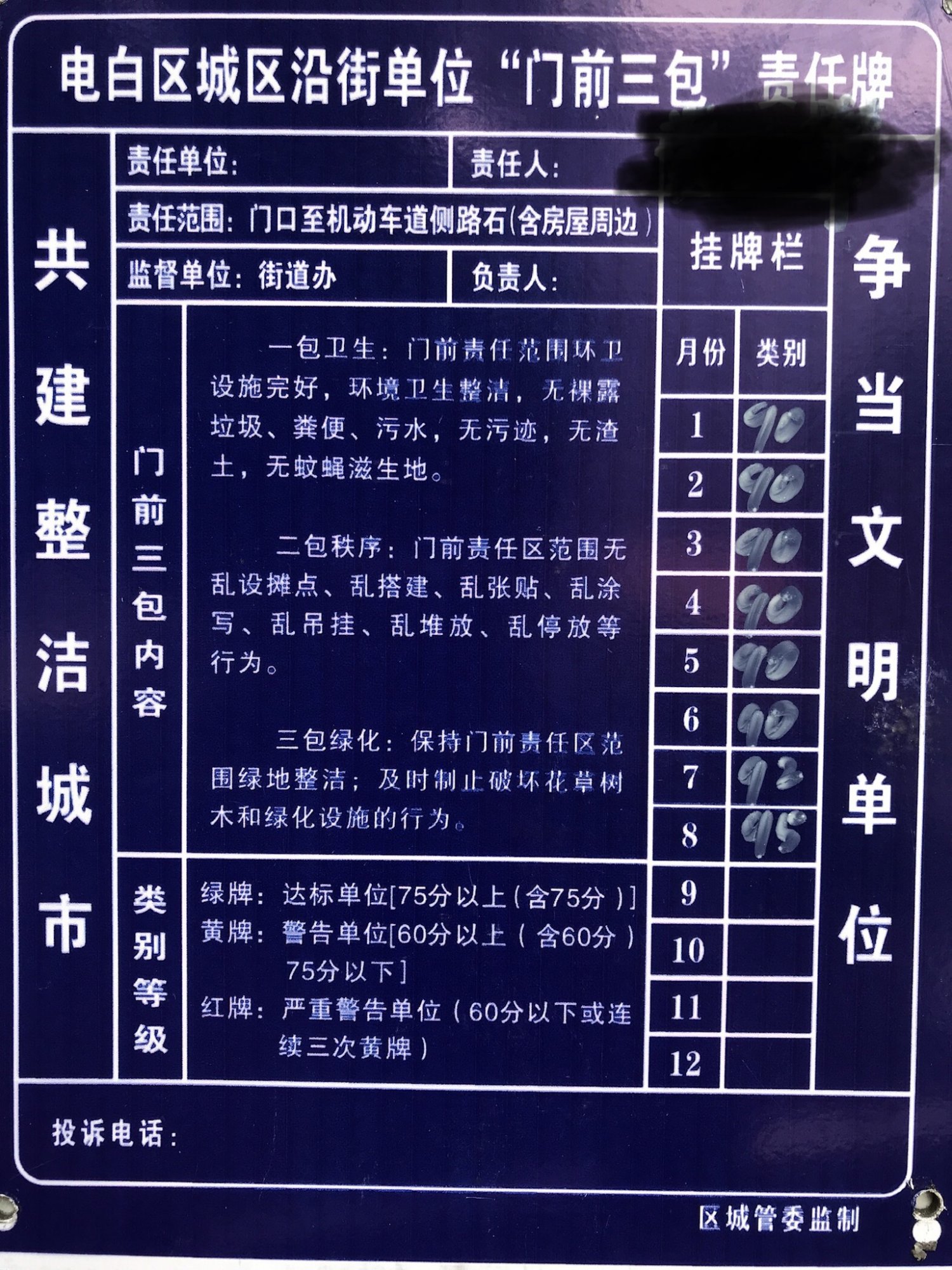 门前三包,举报部门和联系为何省略不印,这个不规范的牌子好意思贴,是谁主导这样违规操作应付双创?